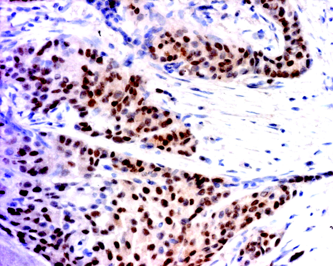 ERα expression. ERα is expressed in about 70% of breast cancer, but, as illustrated above, in ERα -positive breast cancers, there are many ERα -negative cells mixed in with the ERα -positive (brown stain) cells. This image is an example of an invasive ductal cancer of the breast stained with ERα -specific antibody 1D5 (Dako). Cells are counterstained with hematoxylin.