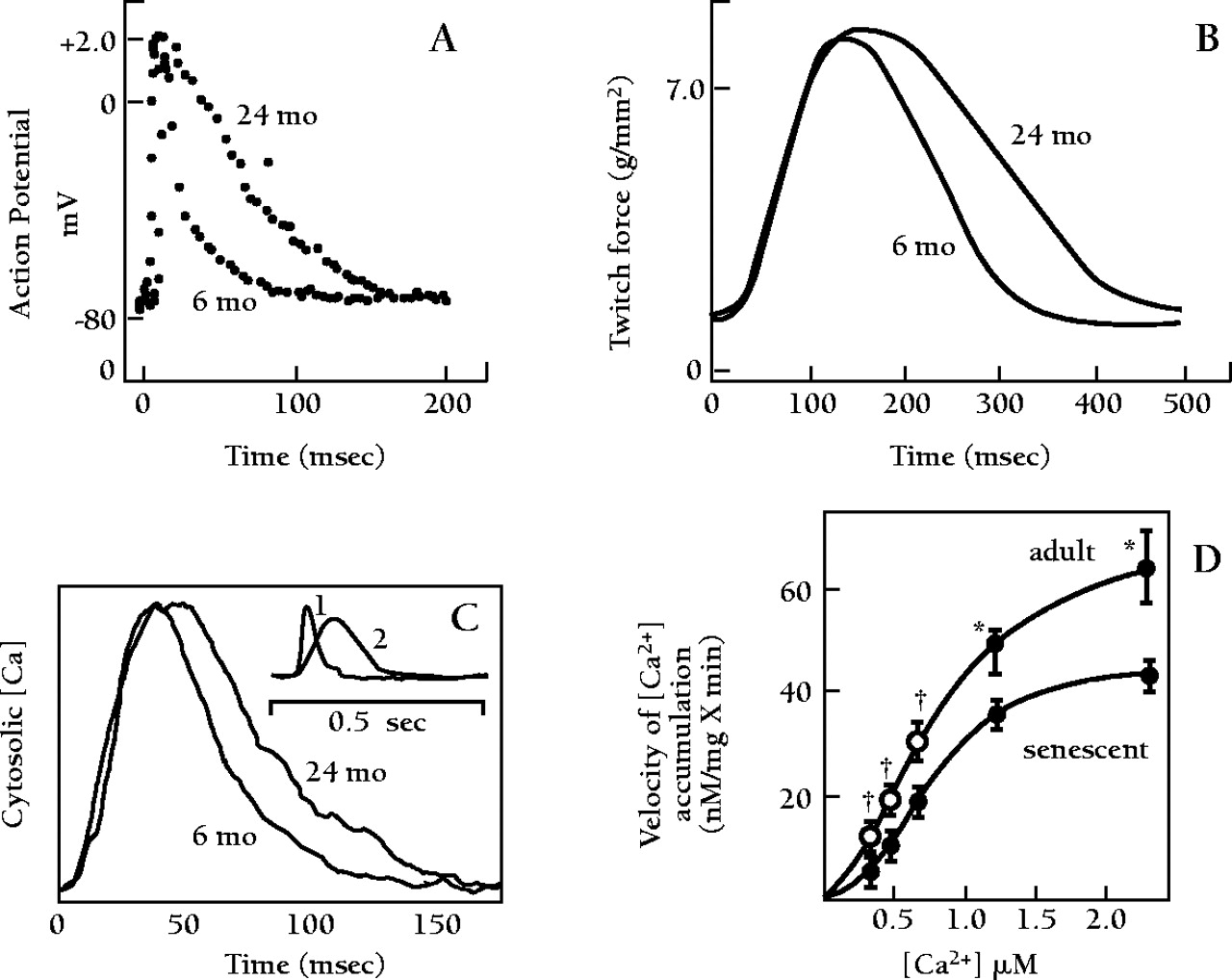 Differences in various aspects of excitation-contraction coupling mechanisms measured between adult (6–9 months) and senescent (24–26 months) rat hearts. A. Transmembrane action potential, and (B) isometric contraction [from (6) ]. C. Cytosolic calcium transient, measured by a change in the luminescence of aequorin injected into several cells comprising the muscle preparation [from (7) ]. D. Sarcoplasmic reticulum Ca2+ uptake rate [from (8) ].