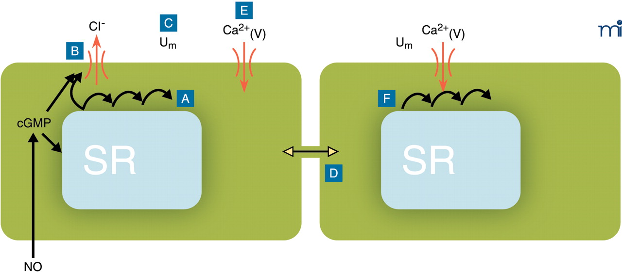 Conceptual model for the generation of vasomotion in rat mesenteric small arteries. The basic oscillator is the sarcoplasmic reticulum (SR), which intermittently releases calcium leading to regenerative waves of calcium traversing the cell (A). In the presence of cyclic GMP (cGMP), this calcium also is able to activate a chloride channel in the plasma membrane (B). If this current is activated in a sufficient number of cells at the same time, cells will depolarize (C). Also cells that are not contracting at that moment will depolarize, because all cells are electrically coupled (D). Depolarization will cause calcium influx through L-type calcium channels (E), which not only triggers contraction but also calcium release in quiescent cells (F), thus resetting their intracellular oscillators. In this way, the likelihood for a sufficient number of cells becoming active together in the next cycle is very high, and the cells in effect become phase-locked. cGMP promotes vasomotion by its permissive action on the ion channel, most likely via protein kinase G–mediated phosphorylation of the channel, but inhibits vasomotion by actions on the SR by influencing intracellular calcium availability, uptake, and/or release. Differences in this balance may explain the variable influence of endothelium in vasomotion. Ca2+(V), voltage-gated (L-type) calcium channel; Um, membrane potential.