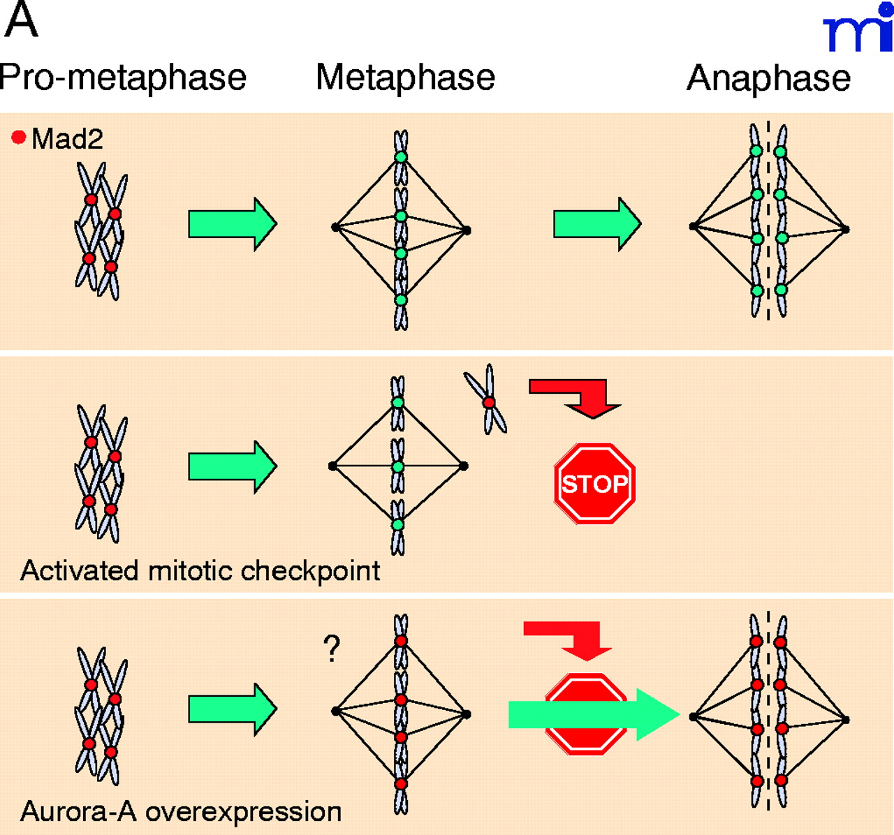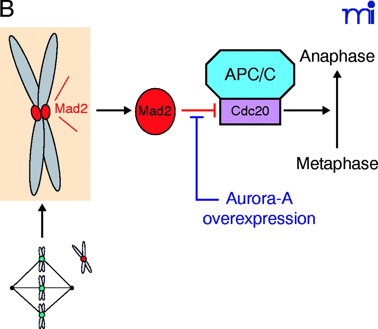In prophase every kinetochore is decorated with Mad2. Once a kinetochore is captured by microtubules, Mad2 labelling disappears. Metaphase-to-anaphase transition will be triggered only when all kinetochores are captured. However, any kinetochore remaining decorated with Mad2 (i.e., unattached chromosome) will activate the mitotic checkpoint leading to cell cycle arrest (Middle). In the presence of overexpressed aurora-A, the cell ignores the Mad2 signal and triggers metaphase exit (Bottom). B. Mad2 is an inhibitor of Cdc20, a known APC/C activator. Overexpression of aurora-A interferes with the Mad2–Cdc20 signal that promotes progression to anaphase (14).