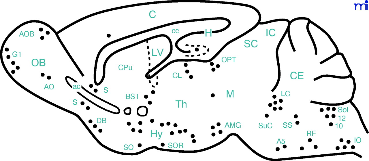 Schematic representation of a sagittal section of the mouse brain showing the distribution of GAL immunoreactivity in neurons (filled circles). A5, A5 noradrenergic cells; ac, anterior commissure; AMG, amygdala; AO, anterior olfactory nucleus; AOB, accessory olfactory bulb; BST, bed nucleus of the stria terminalis; C, cerebral cortex; cc, corpus callosum; CE, cerebellum; CL, central lateral thalamic nucleus; CPu, caudate-putamen complex; DB, diagonal band of Broca; G1, glomerular layer of the olfactory bulb; H, hippocampus; Hy, hypothalamus; IC, inferior colliculus; IO, inferior olive; LC, locus coeruleus; LV, lateral ventricle; M, mesencephalic tegment; OB, olfactory bulb; OPT, olivary pretectal nucleus; RF, reticular formation; S, septum; SC, superior colliculus; SO, supraoptic nucleus; Sol, solitary tract nucleus; SOR, retrochiasmatic supraoptic nucleus; SS, superior salivatory nucleus; SuC, subcoreuleus nucleus; Th, thalamus; 10, dorsal motor nucleus of vagus nerve; 12, hypoglossal nucleus.