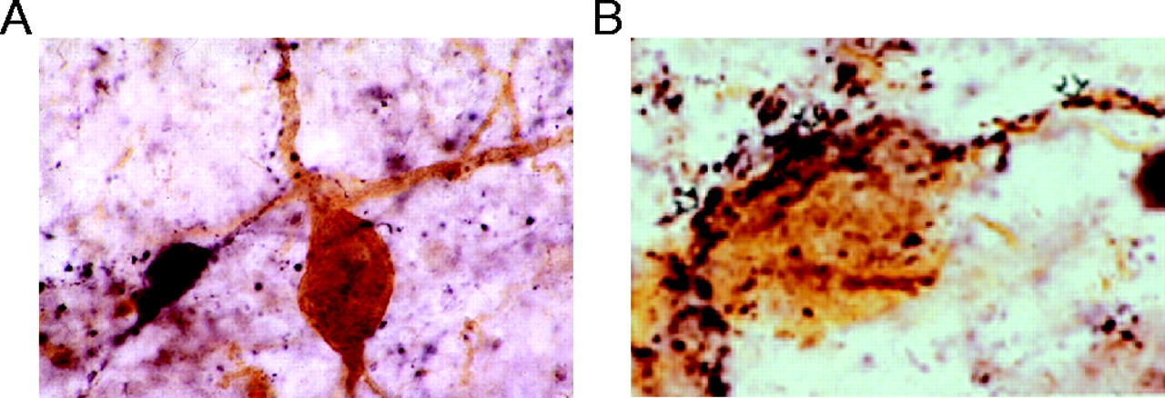 GAL plasticity in the basal forebrain nucleus basalis in AD. A. Photomicrograph shows a magnocellular cholinergic nucleus basalis neuron immunostained with the CBF neuronal marker p75NTR (brown reaction product) and innervated by GAL-ir fibers (dark blue reaction product) in aged control brain. The GAL-ir parvicellular neuron contacting the CBF neuron is visible. B. The photomicrograph shows striking hyperinnervation of GAL fibers impinging upon a nucleus basalis CBF neuron in AD.