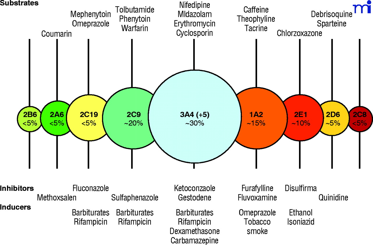 Major hepatic P450 enzymes involved in drug metabolism. Circles are intended to reflect the mean size of the pool of each of the main P450s (CYPs) in human liver (20–24). The exact pattern will vary among individuals. A few commonly recognized substrates, inhibitors, and inducers of these P450s are indicated. [ From an approach by Breimer. For extensive lists see Rendic (22).]