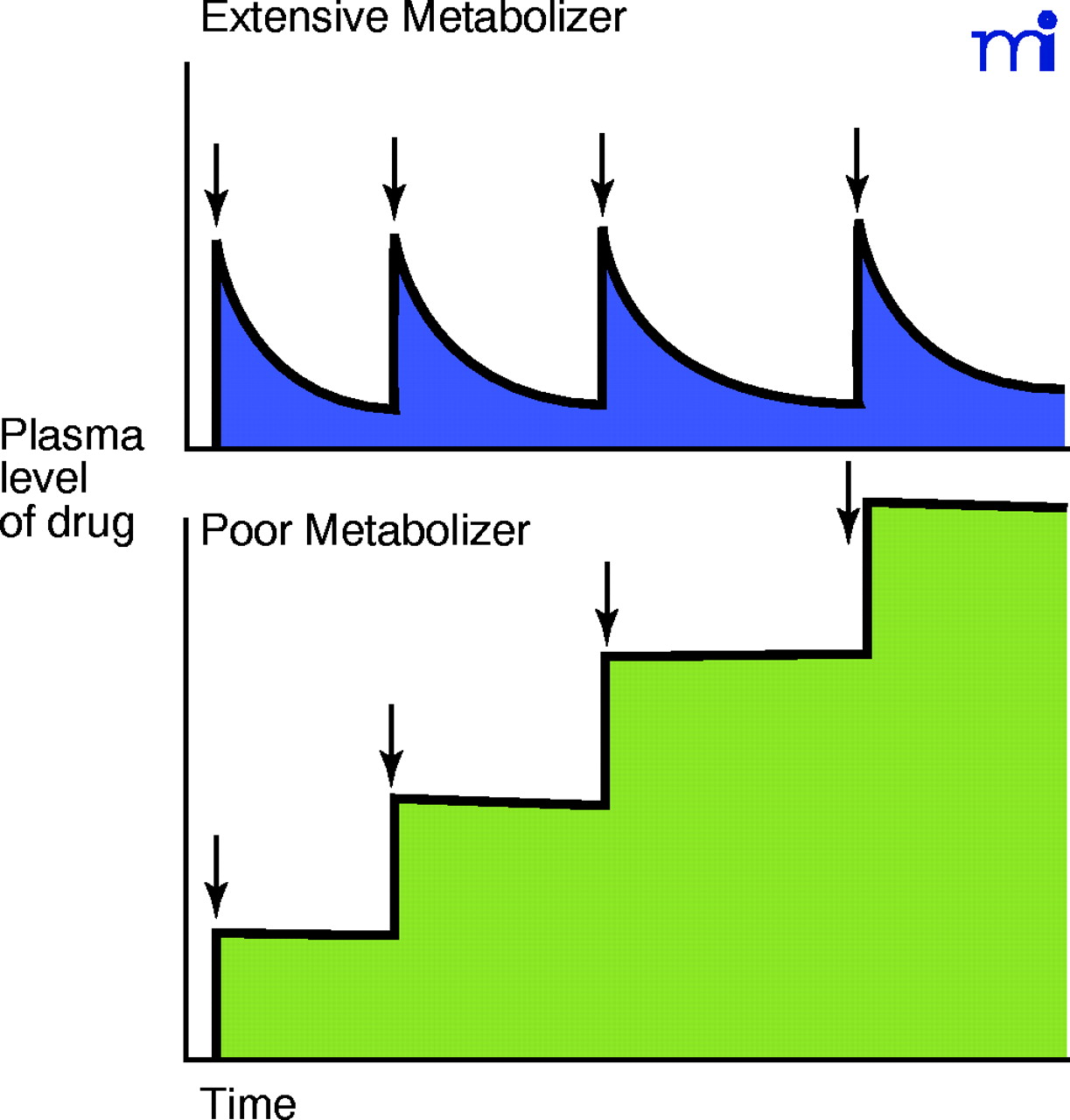 Significance of unexpectedly low metabolism of a drug by P450s. The typical pattern seen with the majority of the population (extensive metabolizers) is shown in the upper panel, where the plasma level of the drug is maintained in a certain range over the period of several consecutive doses (arrows indicate multiple doses). Unusually slow metabolism (lower panel) occurs when a poor metabolizer (without previous knowledge of phenotype) receives the same dose, resulting in an elevated plasma level of the drug. Adapted from (30).