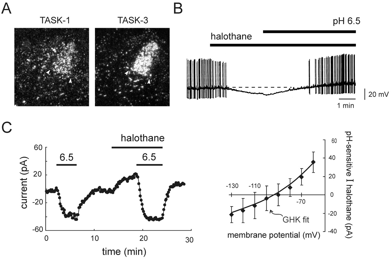 Locus coeruleus neurons express TASK channel transcripts and a pH- and anesthetic-sensitive open-rectifier K+ channel. A. Darkfield photomicrograph of emulsion-dipped sections hybridized with a [33P]-labeled cRNA probe specific to TASK1 (left) and TASK-3 (right) show high density of silver grains overlaying neurons in the nucleus locus coeruleus (LC) (see arrows). B. Halothane (0.3 mM) caused a membrane hyperpolarization that was completely reversed by bath acidification C. (Left) Voltage clamp recording of net membrane current in a locus coeruleus cell held at 60 mV. An acidified bath solution (pH 6.5) induced an inward shift in current and completely blocked a halothane-evoked outward current shift. (Right) Averaged data (± SEM, n=4) showing the IV relationship of the joint pH- and halothane-sensitive current in locus coeruleus neurons; this current was well fitted by using the GHK constant field equation (adapted from 44).