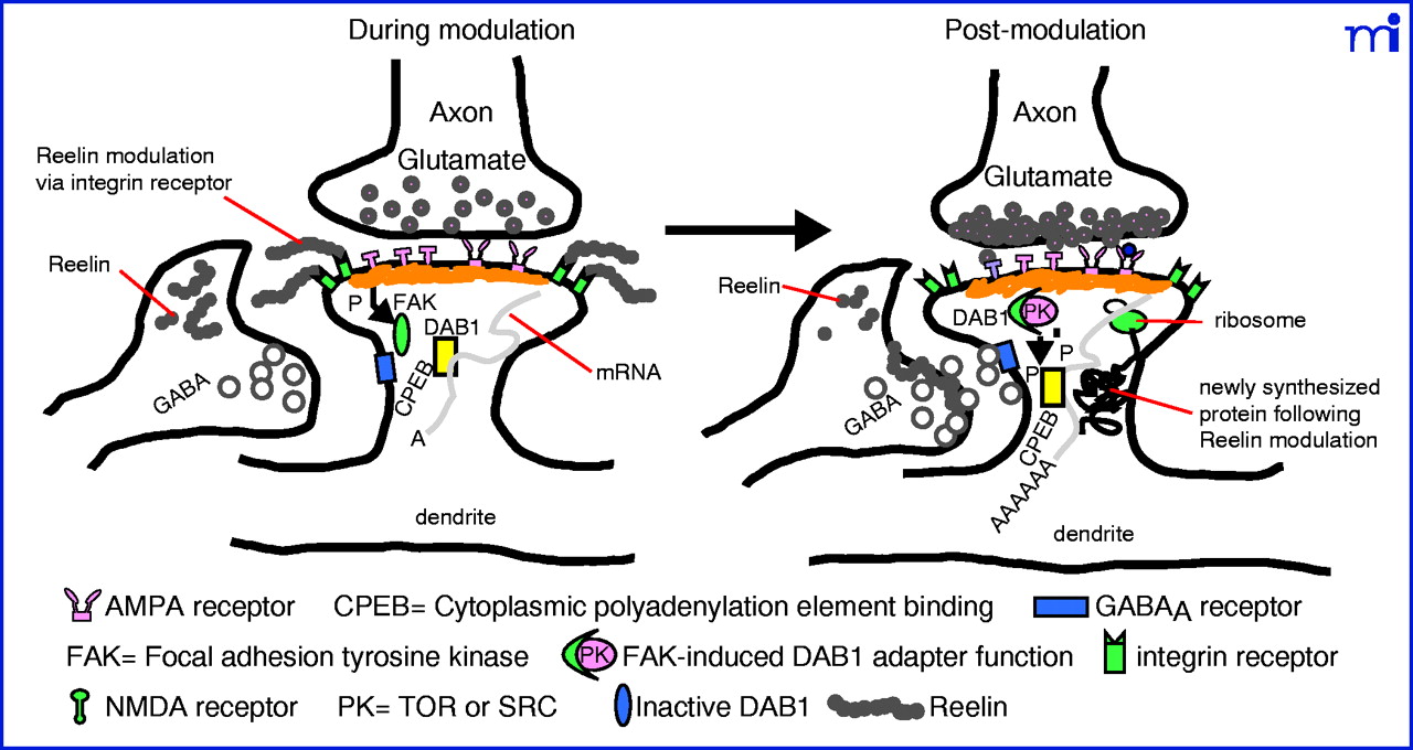 A model for reelin-mediated activation of mRNA translation in pyramidal neuron dendritic spines. Reelin secreted from GABAergic interneurons by a constitutive mechanism interacts with an integrin receptor initiating a cascade that activates translation of spine-resident mRNAs. Reelin is located on postsynaptic densities and initiates a signaling cascade involving the activation of focal adhesion kinase (FAK), phosphorylation of DAB1 and subsequently cytoplasmic polyadenylation element binding protein (CPEB), mRNA polyadenylation and subsequent translation. (Modified from 53.)