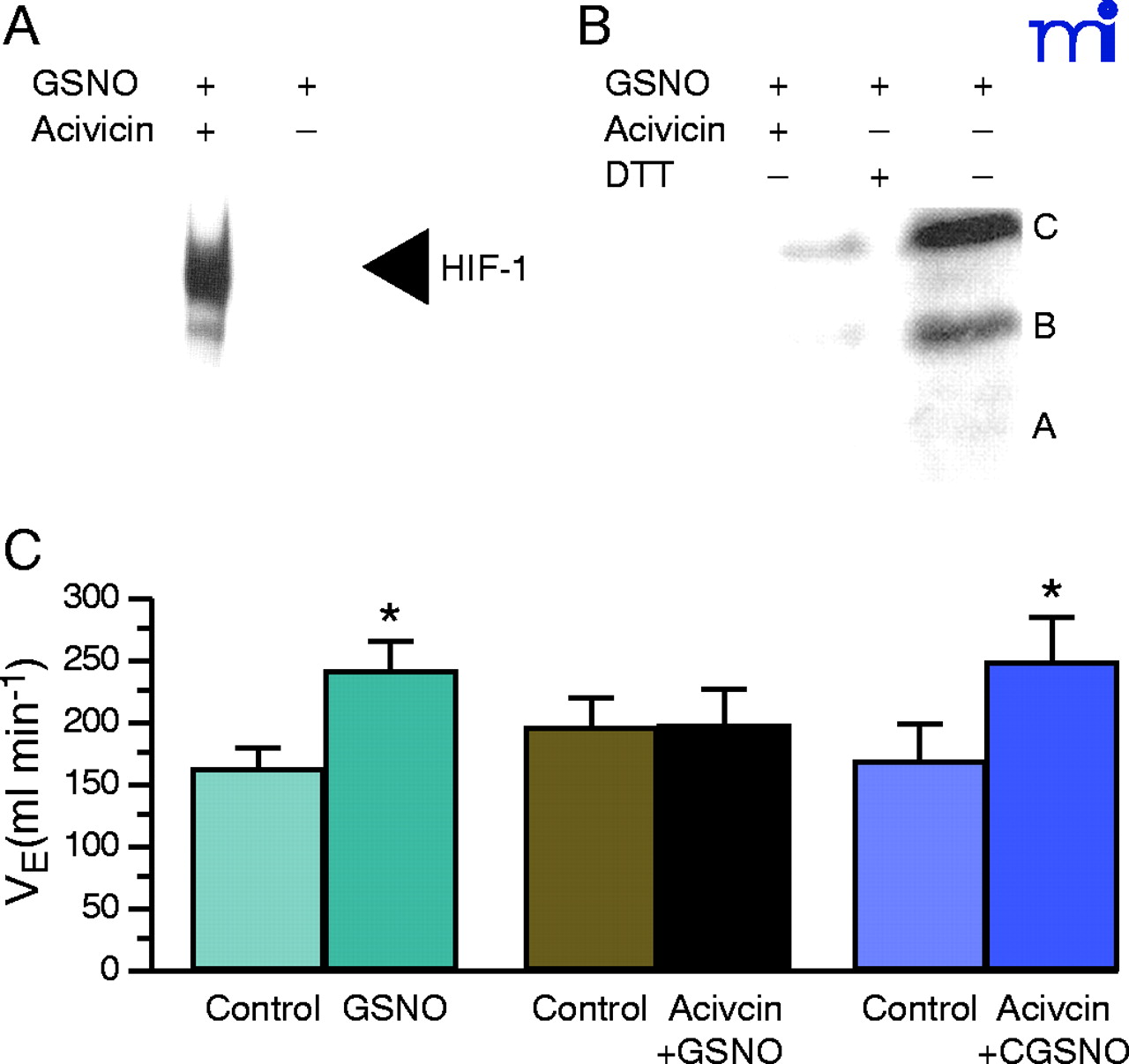 Acivicin reverses the effects of GSNO. A. GSNO-induced HIF-1 DNA binding activity is reversed by acivicin. Nuclear extracts made from bovine pulmonary artery endothelial cells were treated with 100 μM GSNO in the absence (–) or presence (+) or 100 μM acivicin for 4 h. HIF-1 DNA binding activity was determined by electrophoretic mobility shift assay using 3 μg nuclear protein and 1.5 fmol of a 30-bp oligonucleotide containing the HIF-1 DNA binding site. Reprinted with permission from (41) B. GSNO induction of CFTR maturation is inhibited by acivicin and reversed by DTT. Western blot anlysis was performed on 100 μg of wholecell extracts made from CFPAC-1 cells treated with 1 μM GSNO in the presence of 100 μM acivicin for 4 h or 200 μM DTT drug in the last 30 min of the 4 h incubation time. Reprinted with permission (42) C. The GSNO induced-increase in minute ventilation (VE) is blocked by acivicin. VE increases stimulated by microinjection of 10 nmol GSNO were abolished after pretreatment with the gamma glutamyl transpeptidase inhibitor acivicin (7.5 nmol). CGSNO (10 nmol) stimulated VE increased were not modified by acivicin. * indicates statistically significant differences compared to controls. Reprinted with permission (17).