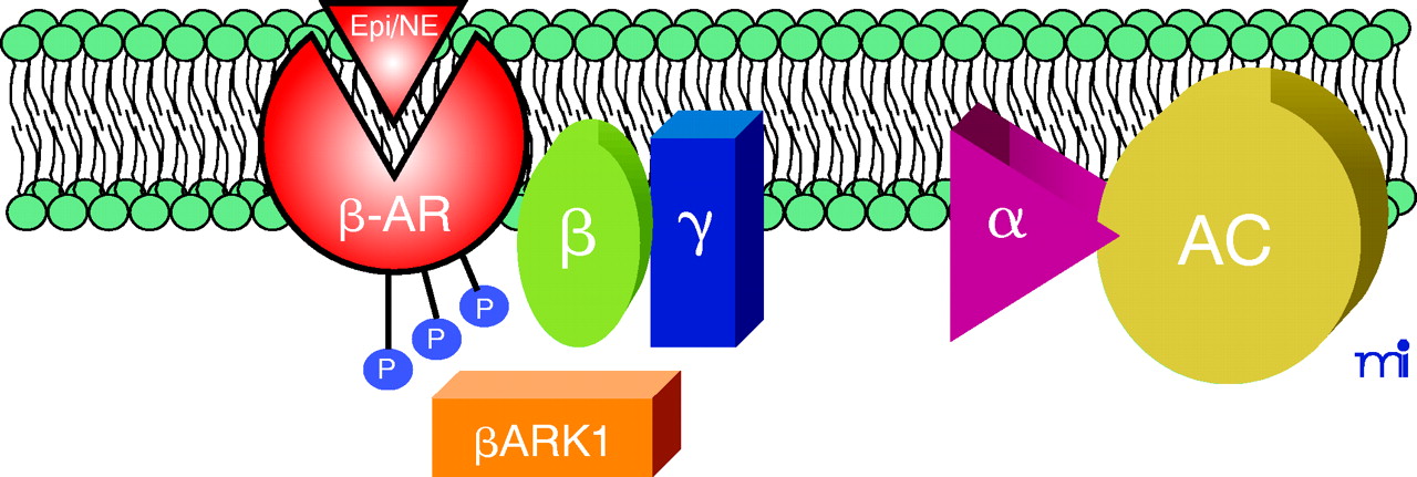 The nexus of catecholamine receptor, G protein, and GPCR kinase: An opportunity for cardiotherapeutic intervention. Schematized is a molecule of βARK1 (i.e., GRK2), the most abundant cardiac GRK, which is positioned, through the interaction between its C-terminal domain and the βγ heterodimer (Gβγ) of an activated G protein, so as to phosphorylate a βAR molecule. Phosphorylation results in cellular desensitization to catecholamines, which may be involved is certain pathological conditions. To prevent the phosphorylation of the βAR (and thereby preclude desensitization), therapeutic strategies may utilize peptides or small molecules that interfere with the interaction between GRKs and the Gβγ heterodimer.