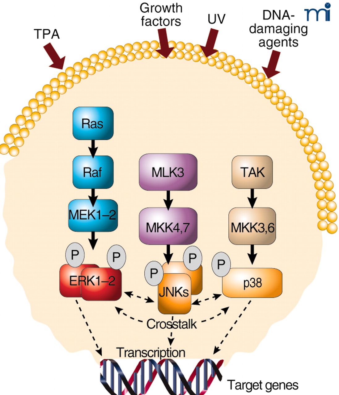 Mitogen-activated protein kinase (MAPK) signaling pathways. MAPKs are activated by a variety of stimuli, including 12-O-tetradecanoyl-phorbol-13-acetate (TPA), growth factors, UV and DNA damage. The final signal commonly includes transcription of target genes leading to cellular responses such as proliferation or apoptosis. TAK, Tumor growth factor β–activating kinase.