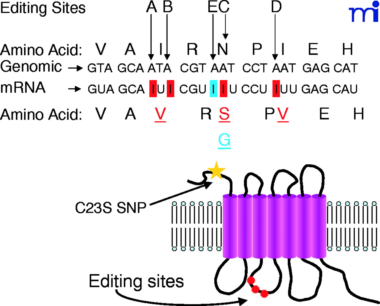 5-HT2C R editing sites. Nucleotide sequence and predicted amino acid sequence alignments between the 5-HT2CR genomic DNA and mRNA sequences. A-I changes are shown in boxes (red), site of editing unique to human 5-HT2CR (blue box). The top row of amino acids indicates the predicted unedited residues, whereas the bottom row shows changes resulting from editing (underlined). The schematic diagram showcases the positions of the Cys23Ser SNP (yellow star) and editing sites (red circles) in the 5-HT2CR.