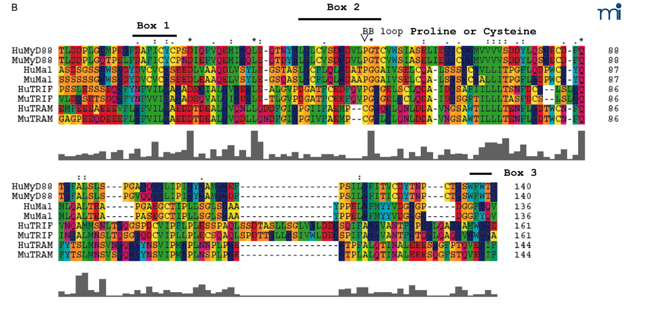Schematic representation of known mammalian TLR adapter molecules. A. MyD88, TIRAP/Mal, TRIF/TICAM-1, and TIRP/TRAM/TICAM-2 are all known TLR adapter proteins, while the function of SARM is not yet known. B. CLUSTAL W alignment of the TIR domains of human and mouse MyD88, TIRAP/Mal, TRIF/TICAM-1, and TIRP/TRAM/TICAM-2. The amino acid colors are based on their physicochemical properties where yellow = small, green = hydrophobic, turquoise = aromatic, blue = positively charged and red = negatively charged. The three important regions, Box 1, 2, and 3 are labeled.