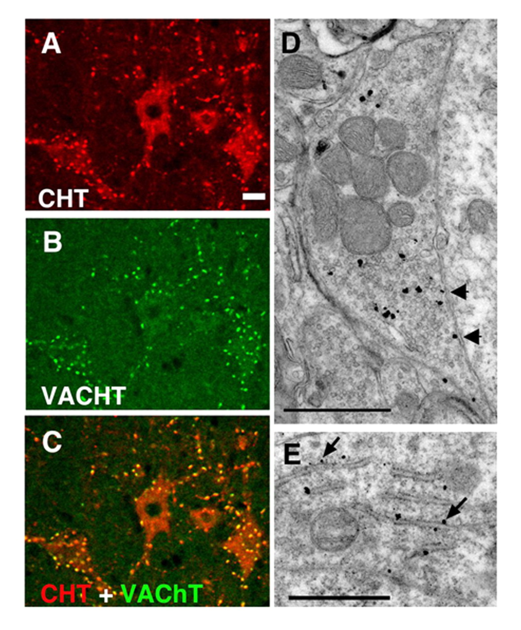 CHT colocalizes with VAChT at presynaptic terminals of cholinergic neurons. (A) In the ventral horn of the mouse spinal cord, CHT immunoreactivity is present in motor neuron cell bodies as well in the large presynaptic C-boutons that surround them (Scale bar = 20 μ m). (B) VAChT is present in the same cell bodies and terminals as CHT, confirming their cholinergic identity. (C) The distributions of CHT and VAChT overlap completely demonstrating that CHT is a constant feature of cholinergic neurons and that it is enriched at presynaptic sites. (D) Immuno-electron microscopy with CHT-specific antibodies illustrates that within an individual cholinergic presynaptic C-bouton, CHT immunoreactivity revealed by silver enhanced gold particles is predominantly associated with presynaptic vesicles and is only occasionally detected at the plasma membrane (arrows). Note that the epitope is on the cytosolic face of the plasma membrane, consistent with the predicted topology of CHT (scale bar = 1 μ m). (E) In the cell body of a cholinergic neuron, a biosynthetic pool of CHT immunoreactivity is labeled with the C-terminal epitope found on the cytoplasmic face of the rough endoplasmic reticulum (scale bar = 1 μ m). [Data adapted from (66).]