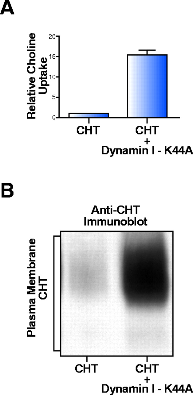 CHT accumulates on the plasma membrane when constitutive endocytosis is impaired. (A) We have observed that cotransfection of COS-7 cells with hCHT plus the dominant negative K44A mutant of dynamin I (127) elicits 15.6 +/– 1.1 fold more HC-3 sensitive [3 H]-choline uptake than cotransfection of hCHT with an empty vector control. (All assays performed in triplicate, n = 3, p < 0.0005.) (B) Cell surface biotinylation confirms that hCHT accumulates on the plasma membrane when clathrin-mediated endocytosis is blocked by expression of the K44A mutant of dynamin I.