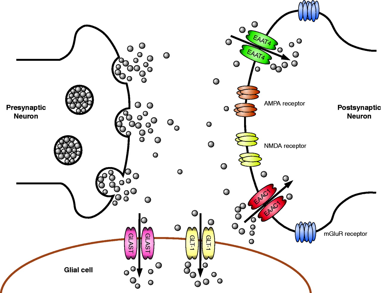 Schematic representation of a glutamatergic synapse. Synaptic release of glutamate results in activation of several different types of glutamate receptors that are situated on the post-synaptic neuron, on the presynaptic terminal, and the surrounding glial cells. For simplicity, receptors are only shown on the post-synaptic terminal. Glutamate is cleared from the synaptic space by transporters that are enriched on the postsynaptic termini and on the glial processes that sheath the synapse. Neurons primarily express the “neuronal” transporters EAAC1 and EAAT4, and astrocytes mainly express the “glial” transporters GLAST and GLT-1. The concentration of glutamate in the synaptic cleft has been estimated to be as high as 10 mM during periods of synaptic activation, but under resting conditions transporters probably reduce concentrations to less than 1 μ M.