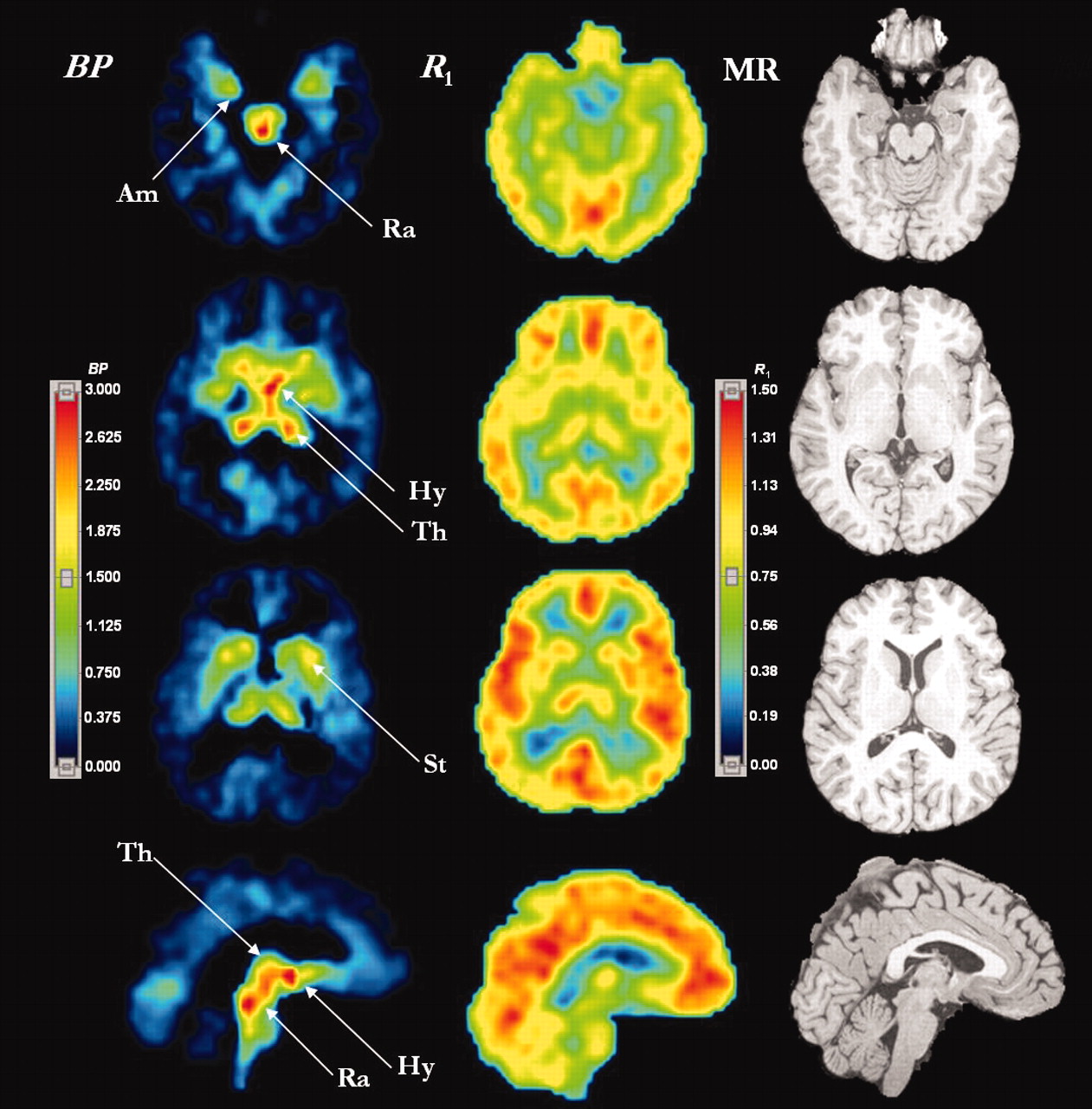 Using imaging techniques to identify the location of SERT. Positron emission tomography of SERT, showing parametric images of [11C]-DASB binding potential (BP) (left column) and relative delivery (R1) (middle column) estimated by the two-parameter multilinear reference tissue model, MRTM2. MRTM2 is a data analysis method that allows “volume pixel” (i.e., “voxel”)-wise mapping of SERT density (BP) and relative blood flow (R1) from dynamic [11C]-DASB PET data. (Voxelization is a process whereby the addition of depth to an image is gained by using a set of cross-sectional images.) Magnetic resonance (MR) images (right column) are shown for comparison. Upper rows are transverse images and the bottom row presents sagittal images. The color display ranges for BP images are 0 to 3.0 and for R1 images are 0 to 1.50 with higher numbers indicating greater SERT density (BP) or greater relative blood flow (R1) reveal where SERT may be more highly concentrated in brain areas. Am, amygdala; Hy, hypothalamus; Ra, raphe complex; St, striatum; and Th, thalamus. This figure was kindly provided by Drs. M. Ichise and R. Innis (64).