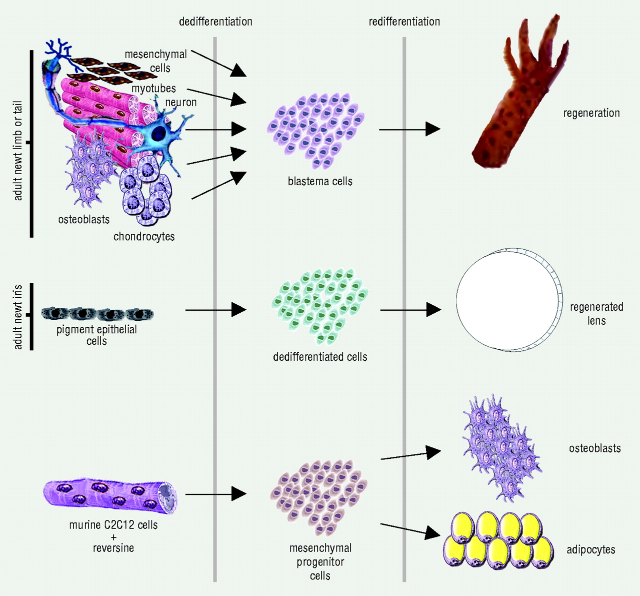Transdifferentiation in urodele limb and lens regeneration and in a committed murine cell line. After amputation of the newt limb (or tail) the intact terminally differentiated cells (such as, mesenchymal cells, myotubes, nervous tissue, bone, or cartilage) dedifferentiate by losing the characteristics of their origin. This dedifferentiation process produces the blastema cells, which then redifferentiate to reconstitute the lost limb. After lentectomy, the dorsal iris pigment epithelial cells lose their pigments and become dedifferentiated cells, which consequently regenerate a perfect lens. A small molecule, reversine, is able to induce dedifferentiation of myotubes formed by murine C2C12 cells. This dedifferentiation produces mesenchymal progenitor cells that are able to differentiate to different cell types, such as adipocytes and osteoblasts. According to this scheme, the reversine produced progenitor cells could be analogous to the blastema cells or other dedifferentiated cells used during regeneration in urodeles.