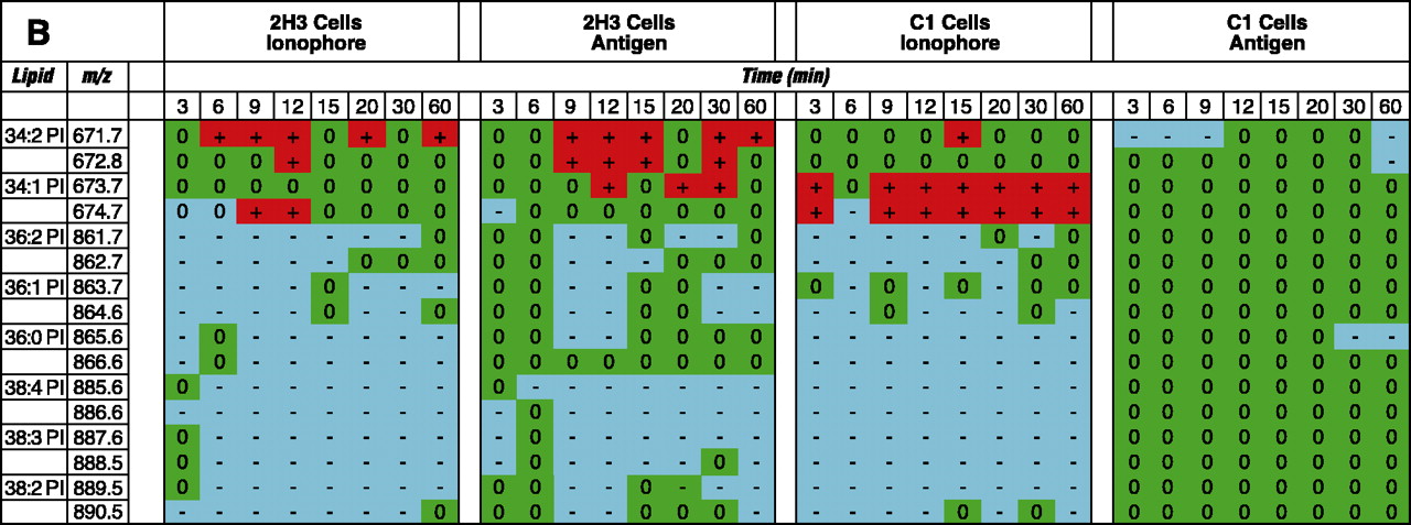 Lipidomics multiplexed analysis. Changes in individual molecular species of membrane phospholipids are shown from 2x105 cell equivalents of lipid extract from RBL-2H3 and mutant RBL mastocytoma cells (B6A4C1) for comparison. Phospholipids were extracted using the Bligh/Dyer extraction procedure under acidic conditions (46). The chloroform phase of the extraction, containing most of the phospholipids, was carefully removed and the solvent was evaporated. The resulting lipid film was immediately dissolved in CH3OH:CHCl3 (9:1), containing 1% NH4OH to facilitate protonation, and analyzed by mass spectrometry. Mass spectra were acquired on a Bruker Esquire-LC 00146 ion trap mass spectrometer (Bruker Daltonics, Billerica, MA) equipped with an ESI interface. All samples were sprayed in positive and negative mode, resulting in a variety of molecular ion signals in the range of m/z 500–1000. Excerpts from the generated positive (A) and negative (B) mode lipid arrays are illustrated. Phospholipids are presented with the class abbreviation preceded by xx:y, where xx is the total carbon atoms in the fatty acid chains and y is the number of double bonds. (See text for details.)