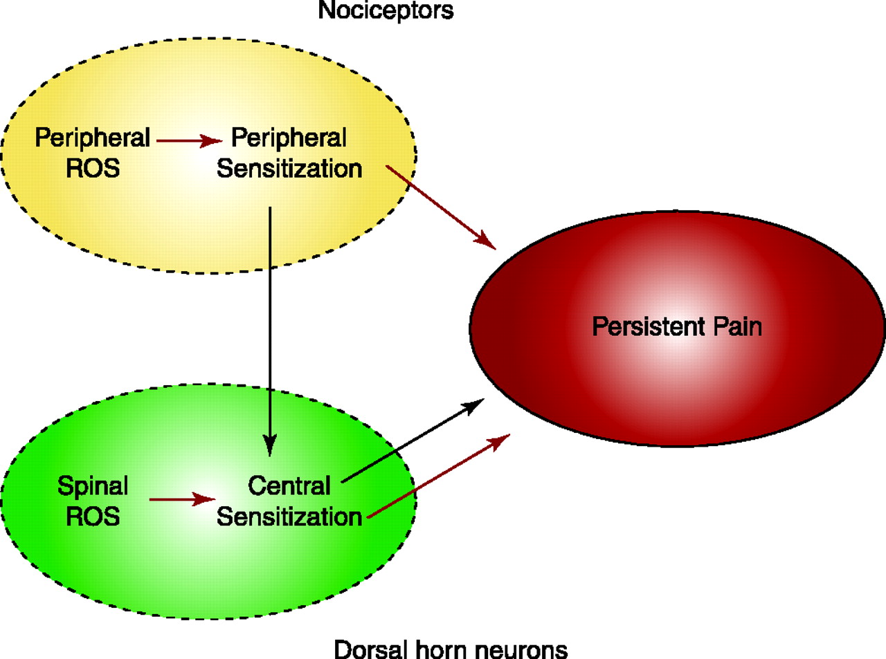 Hypothetical reactive oxygen species (ROS) involvement in the production of persistent pain. In peripheral tissue, ROS are produced in many pathophysiological conditions, including inflammation. ROS will sensitize nociceptors so that they not only respond more vigorously to noxious stimuli but also start to respond to normally subthreshold stimuli. This peripheral sensitization not only induces pain directly (red arrows), but also induces central sensitization in the spinal cord, which indirectly (black arrows) contributes to pain as well. In the spinal cord, ROS are produced in many pathophysiological conditions, such as having persistent abnormal afferent inputs. ROS produced in the spinal cord can lead to central sensitization (red arrows), which in turn produces pain. Thus, central sensitization can lead to pain with or without peripheral sensitization.