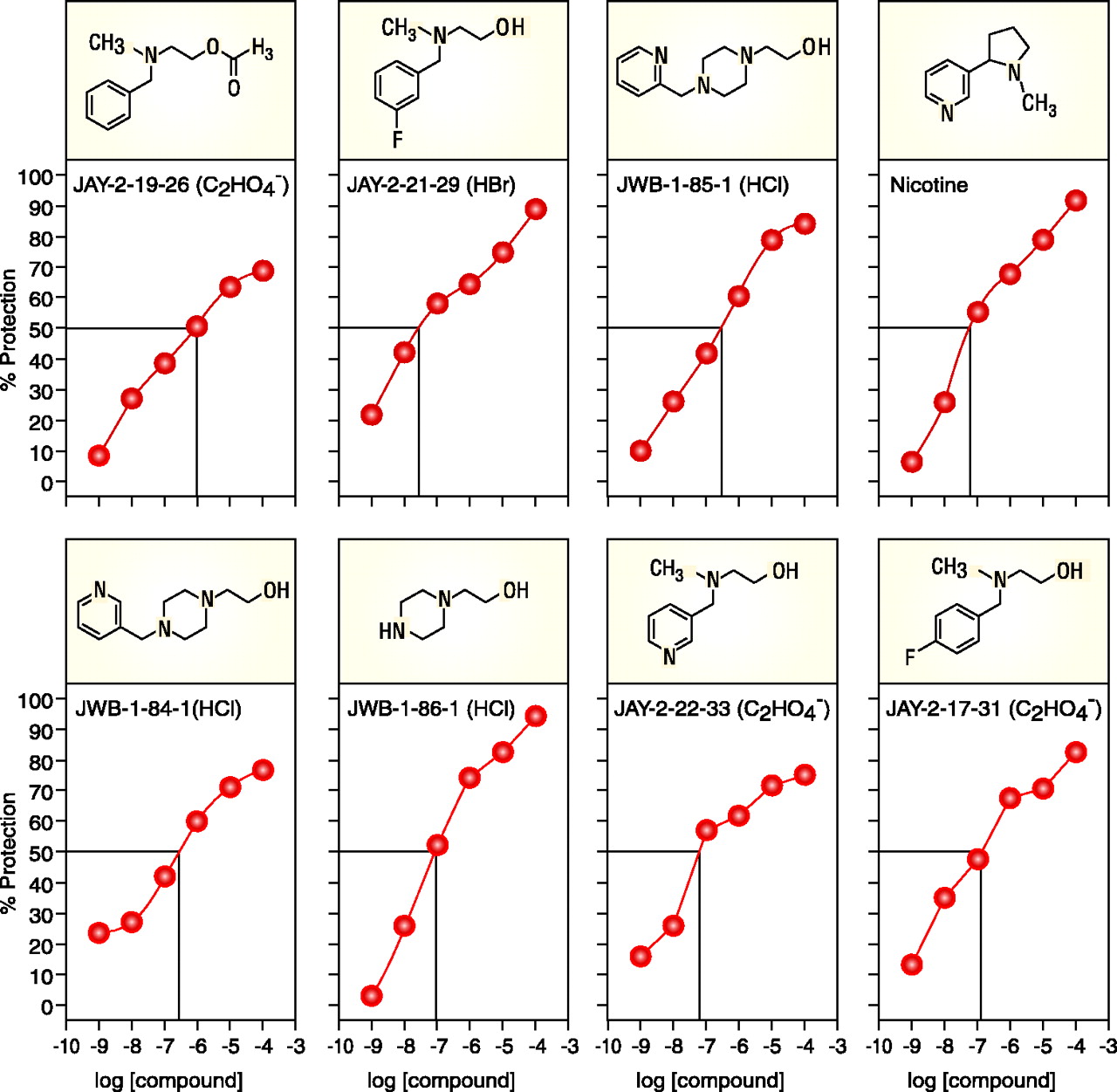 Cytoprotection afforded by choline analogs. Data represent the ability of nicotine and 7 tertiary amine analogs of choline to protect differentiated PC-12 cells from the cytotoxicity associated with growth factor withdrawal. Horizontal and vertical lines within each graph show concentrations that afford 50% cytoprotection.