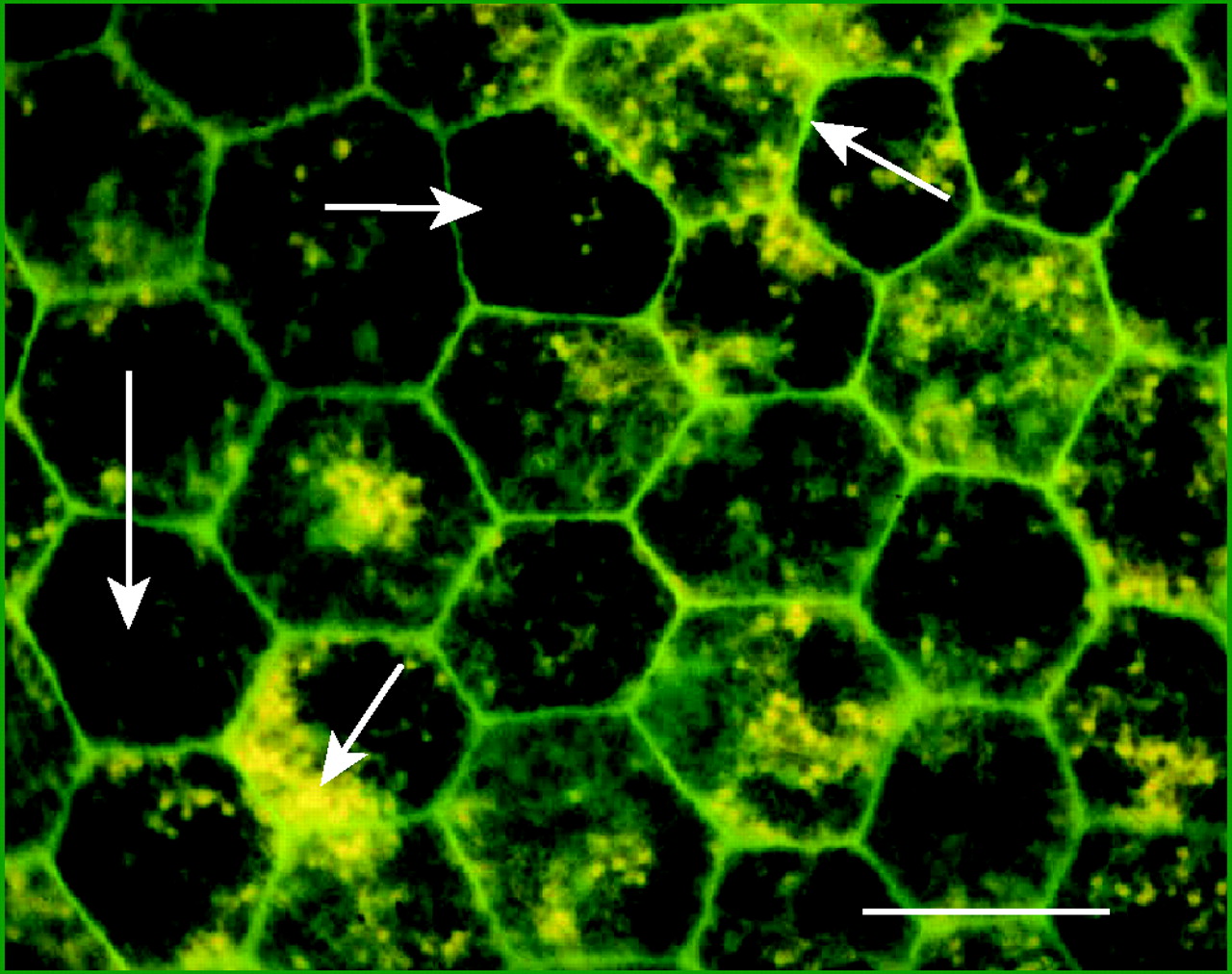 Whole mount of the human RPE monolayer stained with fluorescein phalloidin for actin to show similarity in cell shape but heterogeneity in granule content. Actin is organized in a circumferential microfilament bundle (green), which illustrates the regular hexagonal shape of the cells. Individual cells vary in granule content, with some cells having abundant brown pigment granules (large arrows) and others abundant yellow lipofuscin granules (small arrows). The specimen was prepared by lifting off the neural retina, then processing the RPE with underlying choroid for epifluorescence microscopy. Scale bar: 20 μm.