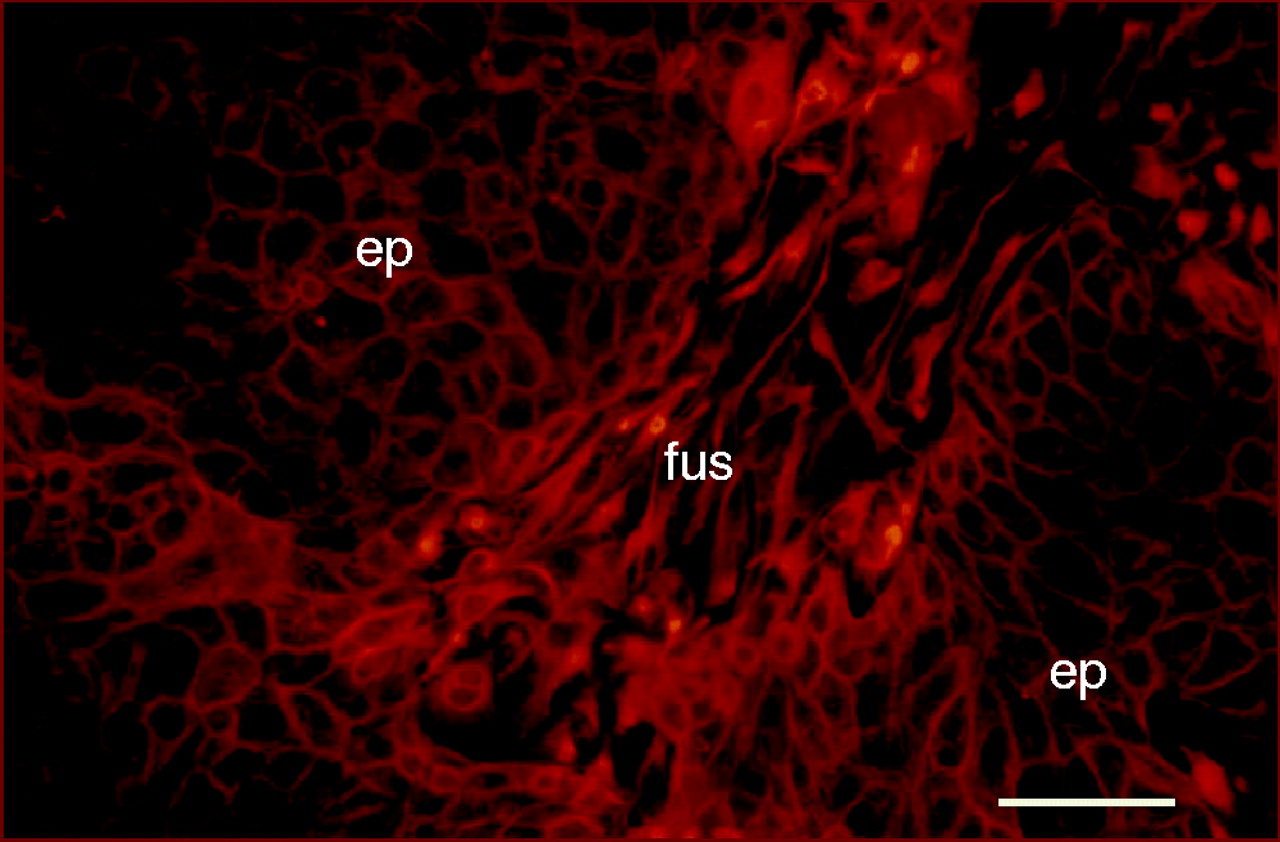the same culture. Adjacent colonies of highly epithelioid (ep) and highly fusiform (fus) RPE cells are shown. Epifluorescence microscopy; scale