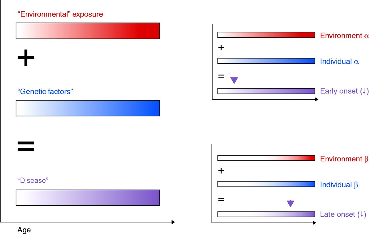 Environmental (red) and genetic factors (blue) conspire to generate common disease (purple). Over time, environmental stressors (broadly defined, to include unhealthy behaviors as well as toxicants), along with genetic factors (such as metabolites and biomolecular activities), may act cumulatively to produce disease (left). But because disease course may be so variable (right), depending on a multiplicity of diverse factors, it has been impossible to assess the causative nature of many common chronic diseases. The availability of modern post-genomics methodologies now challenges environmental health science to detail disease causation in terms of all factors that fall under the rubrics of “environment” and “genetics.”