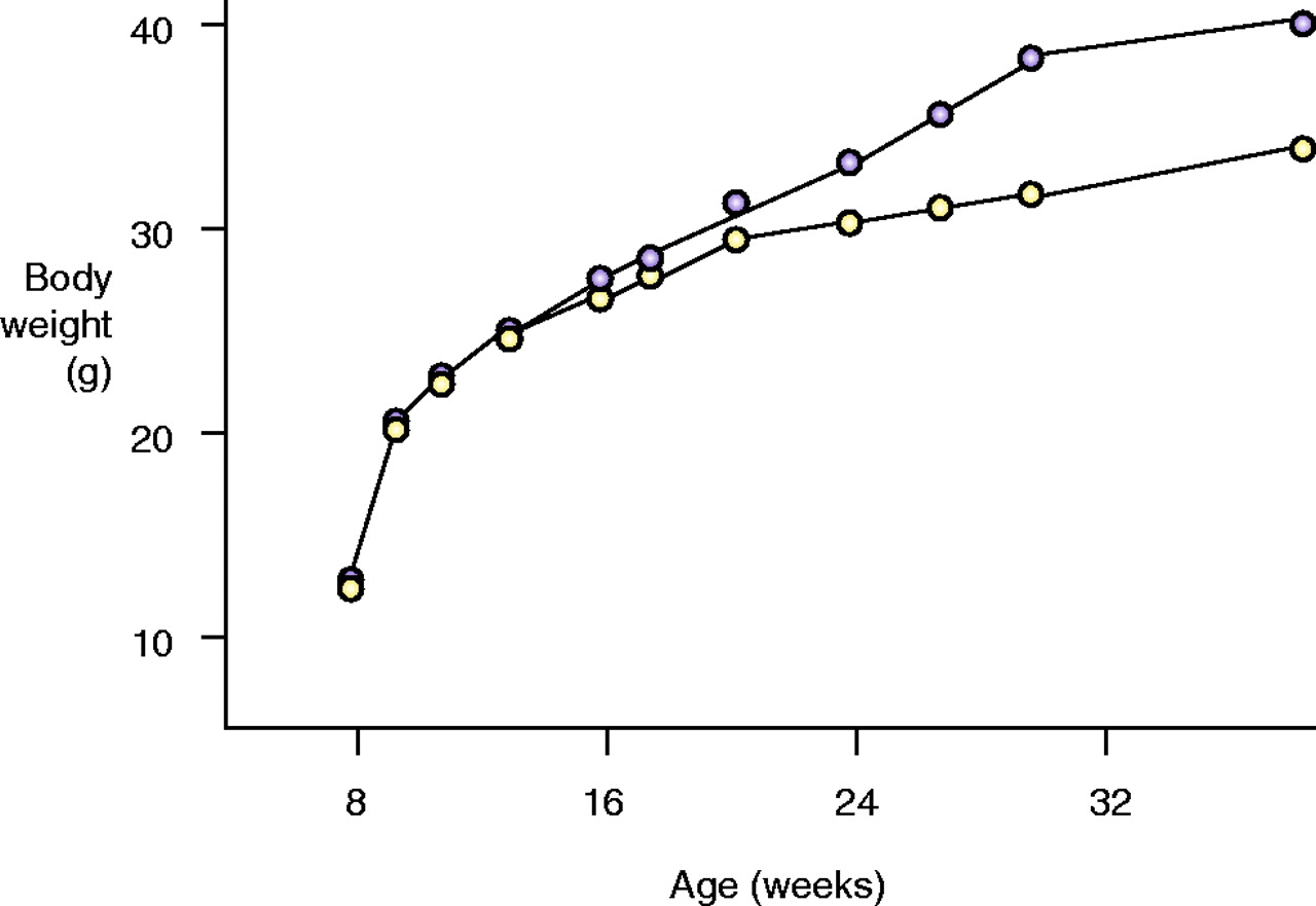 Metabolic peculiarities of mice lacking the serotonin 5-HT2Creceptor. A. The knockout mice (purple)manifest late-onset obesity, weighing thirty percent more than their wild-type litter mates (yellow)after forty-two weeks of age. B. In addition to being hyperphagic, the knockout mice exhibit metabolic hormone changes including the development of hyperleptinemia and hyperinsulinemia. Data reproduced with permission from (62). Copyright Nature Publishing Group 1998.