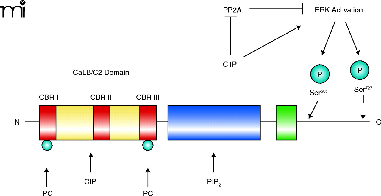 A hypothetical mechanism of cPLA2activation in response to the generation of C1P. The structure of cPLA2α includes a CaLB/C2 domain (red and yellow), containing calcium binding regions (CBRs I, II and III; red), the PIP2 domain (i.e., the catalytic domain; blue), and the hinge region (green). C1P has multiple roles in activating cPLA2α. Within the structure of cPLA2α, Ser505 and Ser727 can be phosphorylated (blue spheres), by ERK, to activate cPLA2α; C1P is shown as a direct activator of ERK as well as an indirect activator of ERK by inhibiting protein phosphatase 2A (PP2A). C1P also interacts directly with cPLA2 near CBRII. Additionally, C1P increases calcium (Ca2+) concentrations, in a compartmentalized manner, in order to induce the association of cPLA2α with perinuclear membranes. Sites of interaction with C1P and phosphatidylcholine (PC) are also indicated. See text for details.