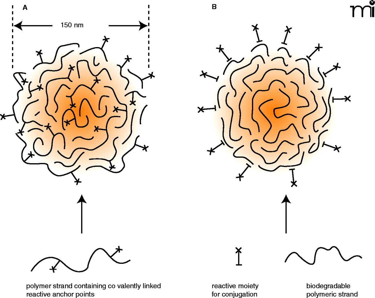 A schematic representation of polymeric nanoparticles of approximately 150 nm diameter with anchor points for conjugation. These anchors can form an integral and covalent part of the polymer stand prior to nanoparticle assembly (A). PLGA, commonly used to make solid nanoparticles, lacks the necessary functional groups for covalent conjugation. Functionality added prior to assembly ensures that at least some of the functional groups exist at the surface, with most submerged within the nanoparticle matrix. Alternatively, functionality can be adsorbed onto the nanoparticle surface once its assembly is complete (B).