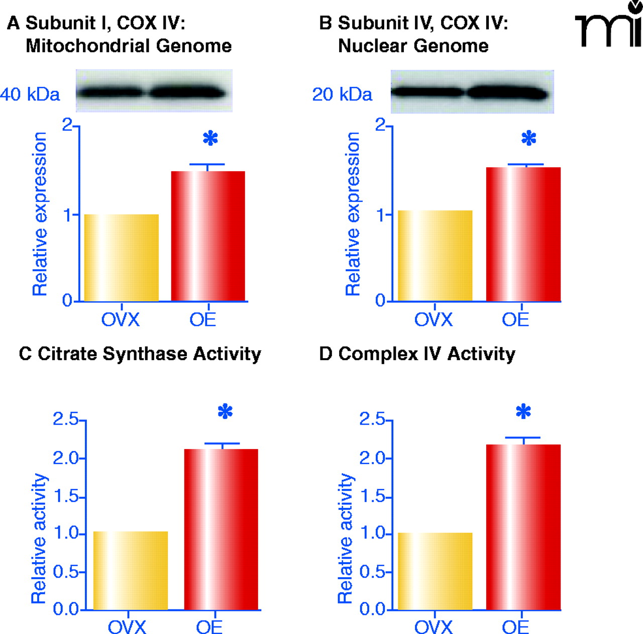 Estrogen alters oxidative phosphorylation by increasing levels and activities of key enzymes. Female ovariectomized (OVX) rats were treated in vivo with estrogen for three weeks (OE). Mitochondria were isolated from cerebral vessels and complex IV subunit I (A; encoded by mitochondrial genome) and subunit IV (B; encoded by nuclear genome) were probed by Western blot. Enzyme activities of citrate synthase (C) and complex IV (D) are also shown. Mean data are expressed as fold difference vs OVX. *p≤0.05. Adapted from (11) by permission of ASPET.