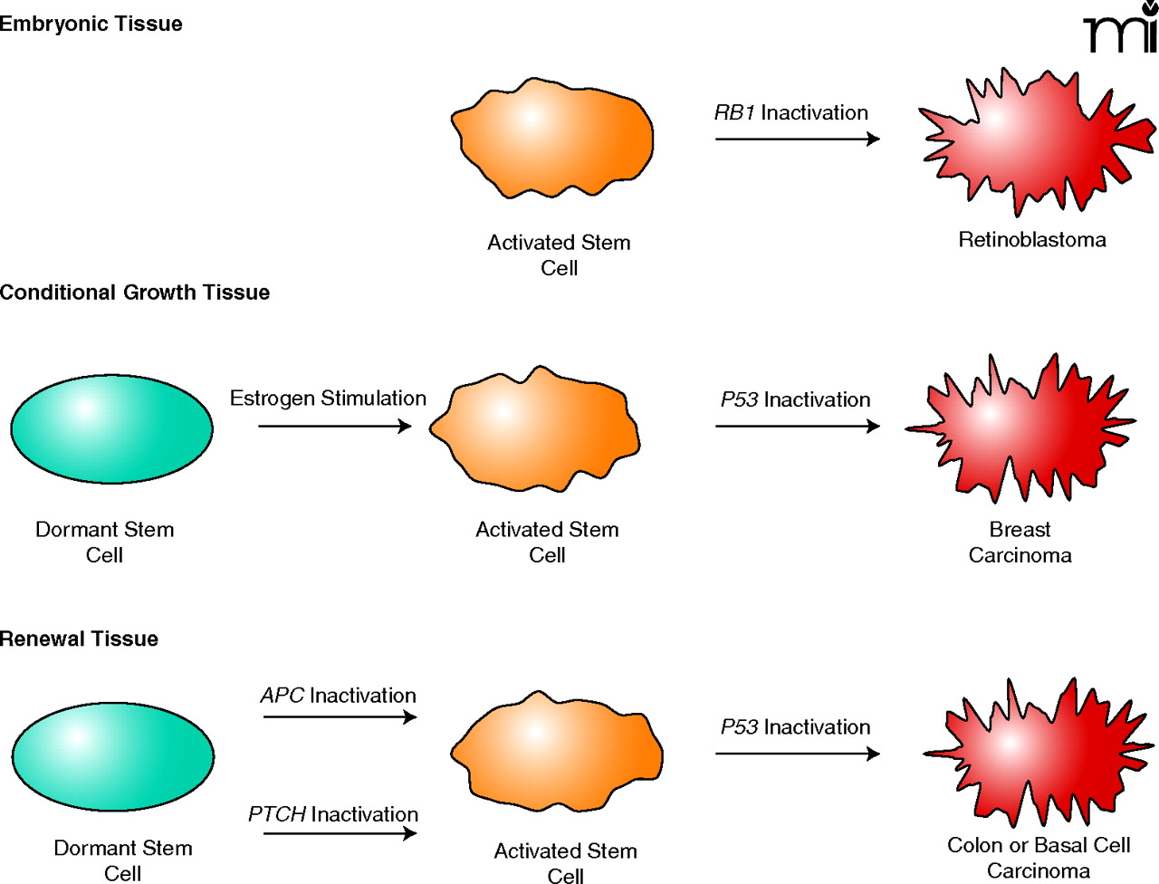 Carcinomas arising from activated cancer stem cells in different types of tissue. Embryonic tumors arise from normal embryonic stem cells. They are already rapidly dividing (activated) and require few alterations to become malignant. Conditional growth tissues such as the breast are activated by hormones during puberty and during reproductive life. Activated stem cells in these tissues suffering tumor suppressor gene mutations give rise to premalignant lesions progressing to malignancy. Renewal tissues such as the colon and skin have dormant or slowly replicating stem cells. Certain tumor suppressor gene mutations give rise to activated stem cells with uncontrolled replication. Subsequent mutations give rise to tumor progression.