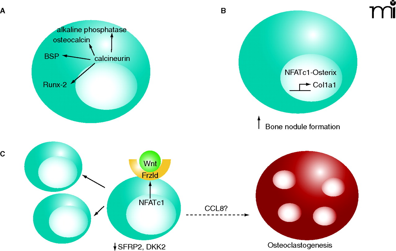 Findings from three recent studies on effects of the calcineurin-NFAT pathway in osteoblasts. A. Overexpression of calcineurin increases the expression of the bone differentiation markers alkaline phosphatase, osteocalcin, bone sialoprotein (BSP), and Runx-2 20). B. Expression of NFATc1 increases the gene expression from the collagen 1a1 promoter and also increases the number of bone nodules (i.e., NFATc1 expression promotes bone formation) (16). NFATc1 forms a complex with the transcription factor Osterix. C. When a nuclear NFATc1 mutant (NFATc1nuc) is expressed in mice, expression of the mutant in bone is observed solely in osteoblasts (17). There was concomitant osteoblast proliferation, increased expression of Wnt4 and Frizzled 9, and decreased secreted frizzled-related protein 2 (SFRP2) and the Wnt antagonist dickkopf2 (DKK2). The expression of chemokine CCL8 was increased and osteoclastogenesis—whereby the fusion of precursor cells (not shown) to form mature multinucleated osteoclasts—was stimulated. Blue cells represent osteoblasts; the red cell represent a mature osteoclast.