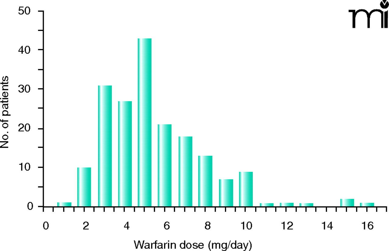 Interindividual variability in warfarin dose. Histogram of warfarin maintenance dose in 185 patients of European descent attending antiocoagulation clinics in Seattle.