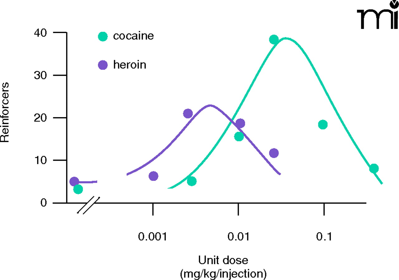 Bimodality of function in self-administration studies. In this graph, the dose per injection is shown along the abscissa. The number of injections that are self-administered (reinforcers) is shown along the ordinate. Note that low and high unit doses of cocaine and heroin result in few reinforcer deliveries, whereas intermediate doses of either drug result in the greatest self-administration. As discussed in text, this type of dose-response relationship is not easily interpreted in terms of reinforcing strength.