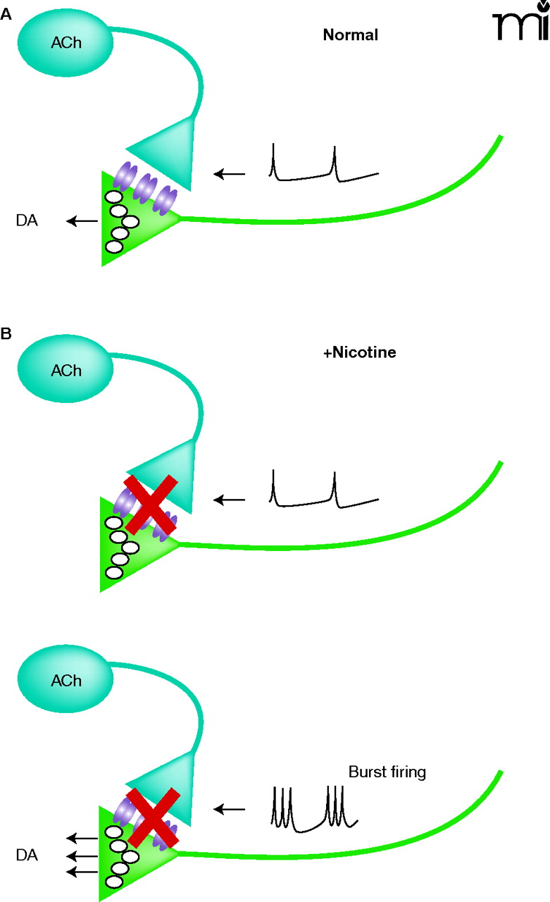 A diagram of the modification of dopamine release dynamics by nAChRs on dopamine terminals. A. The illustration indicates control conditions, where endogenous ACh release from cholinergic interneurons causes a high probability of dopamine release. Low frequency stimulation results in dopamine release that is very similar to that seen with high frequency burst-type stimulation. B. Nicotine treatment (upper panel) desensitizes the presynaptic nAChRs on the dopamine terminals, lowering release probability and decreasing the dopamine secretion elicited by low frequency stimulation. Under these conditions, high frequency burst firing (lower panel) causes more dopamine release than that seen under control conditions. Similar effects are seen with nAChR antagonists.