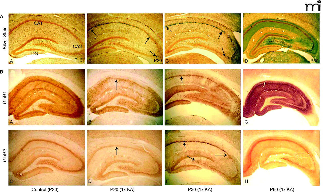 Maturational switch in neuronal vulnerability after status epilepticus. A. Photomicrographs of age-dependent kainic acid (KA) seizure-induced neurodegeneration (silver impregnation 3 days after status epilepticus). (A) KA seizures at postnatal day 13 (P13) resulted in control labeling and minimal or no argyrophilia (silver staining). (B) At P20, 1×KA produced robust injury that was preferential to the CA1 subregion (between arrows); few scattered CA3a neurons were labeled by the silver stain (arrow). (C) At P30, the CA1 was still preferentially marked by the silver stain (arrows), but many scattered neurons of the CA3a were also argyrophilic and the hilus was spared (arrow). (D) At P60, the pattern reversed such that CA3a-c and hilus were predominantly affected with high intensity labeling of dendritic arborizations (grey color); few CA1 neurons were labeled. 40× magnification. B. P20 rats: Control photomicrographs of GluR1A (A) and GluR2B (C) show uniform and intense immunolabeling of the hippocampus at 72 hrs after 1×KA, GluR1B protein is markedly decreased in CA1 and dentate gyrus (DG) but is sustained in the CA3 and ventral DG (B). GluR2B protein is decreased in CA1 (D) but much less so than that of GluR1A (B). P30 rats: GluR1A immunolabeling (E) after 1×KA shows significant depletion of protein in CA1 neurons; GluR1A was sustained in surviving CA3 neurons. In contrast, at P30 GluR2B (F) protein was increased in CA1 and marked the injured neurons. GluR2B protein was decreased in surviving CA3 subregions. (G), In contrast, at P60, GluR1A immunodensity was significantly dense in CA1 and CA3 whereas GluR2B (H) was decreased in the CA3 and hilus. Modified from (32, 45). Reprinted with permission.