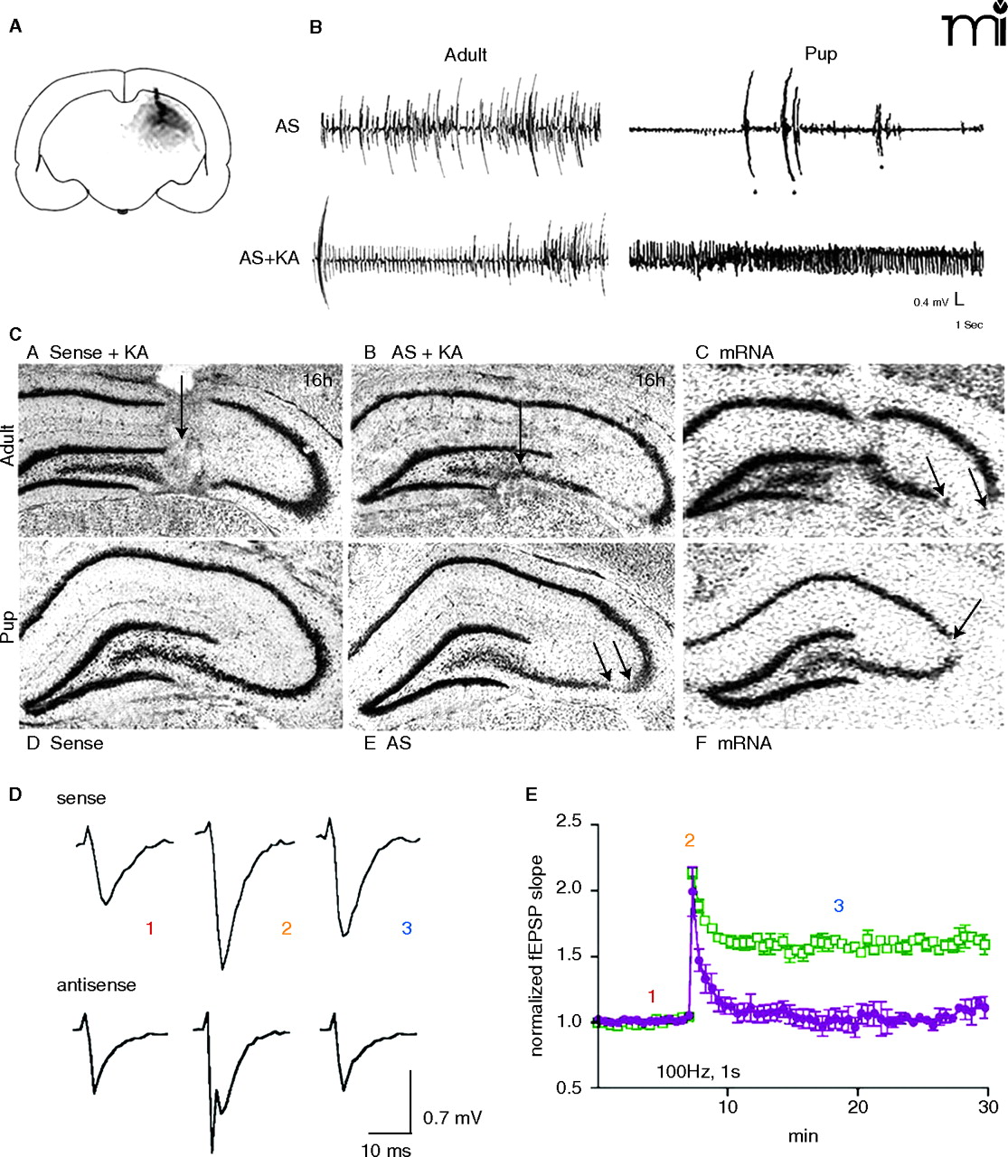 GluR2Bknockdown produces age-depenedent epileptogenicity and neurodegeneration. A.33P GluR2B antisense deoxyoligonucleotides (AS-ODN) autoradiography showed the spread and accumulation of our GluR2B antisense injection was limited to the dorsal ipsilateral hippocampus, as indicated by schematic outline of a radiolabeled coronal section. B. In adults, following knockdown of GluR2B expression in the hippocampus alone, EEG recordings showed typical asynchronous activity and normal movement artifacts (upper left trace). Similarly, GluR2B knockdown followed by KA injection did not alter the rhythmical activity in the EEG when compared to KA controls (bottom left trace). In pups, GluR2B knockdown in the absence of KA, produced spontaneous convulsive seizure-like behavior, including body tonus with fore-limb extension and laying on one side; this behavior was associated with high-frequency low-amplitude rhythmical activity of increasing size. Large movement artifacts shown represent intermittent bilateral jerking movements (asterisks) (upper right trace). In GluR2B AS-ODN–treated pups lacking the phenotypic behavior (bottom right trace), a low concentration of KA produced high-frequency rhythmical oscillations associated with tonic-clonic seizure behavior. C. As predicted by the procedure, after GluR2B knockdown and KA-induced seizures, GluR2B mRNA expression was unaltered in CA1 and DG regions but was decreased or lost only within regions of CA3 cell loss at either age [between the arrows in panel (C) and at the arrow in panel (F)]. D. There was a population spike (recruitment of firing) over the excitatory postsynaptic potential (EPSP) after GluR2B expression knockdown compared to that observed in sense-ODN–treated controls (1, baseline; 2, 100 Hz tetanic stimulation; 3, post-tetanus response). E. Long-term potentiation (LTP) was attenuated (3) after GluR2B knockdown where as the induction was unaltered (2). Modified from (75, 76, 142). Reprinted with permission.