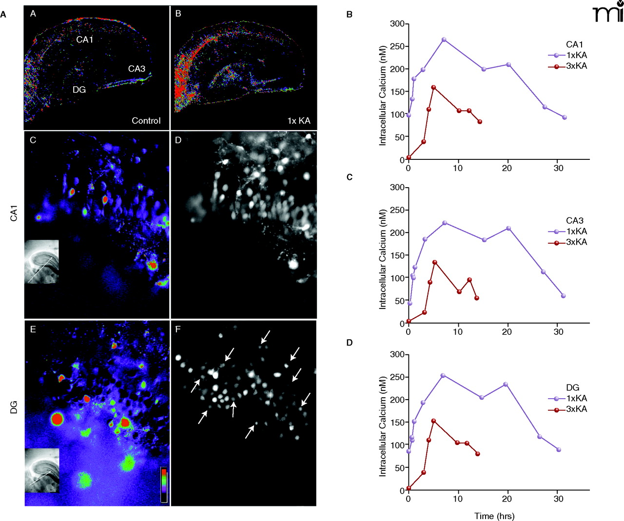 Ca2+imaging following single vs. multiple early-life seizures. A. The FURA 2AM dye indicator was used to measure intracellular Ca2+ at P13 after single (1×KA) or multiple (3×KA) episodes of KA-induced seizures that were induced on P6, P9, and P13. (A). Ca2+ visualization of hippocampal neurons loaded with Fura-2AM in control slices show low amounts of Ca2+ in presence of TTX. (B). Five hours after 1×KA treatment, basal Ca2+ amounts were elevated throughout the hippocampus but particularly in CA1 [(C), (D)] and DG [(E), (F)]. B. Time course of elevated basal Ca2+ concentrations after 1×KA vs 3×KA in CA1 (B), CA3 (C), and DG (D).
