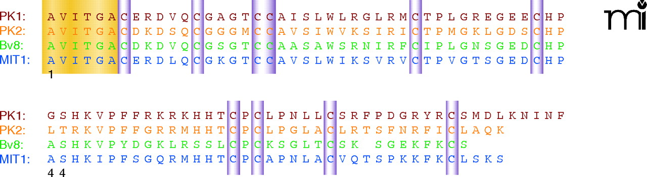 Amino acid sequences of human PKs and their analogs from frog and snake. The sequences of human PK1 (red) and PK2 (orange) are compared to that of frog (green) and snake (blue). The conserved N-terminal hexapeptide is highlighted in yellow. Ten conservative cysteine residues are highlighted in purple. Adapted from (6).