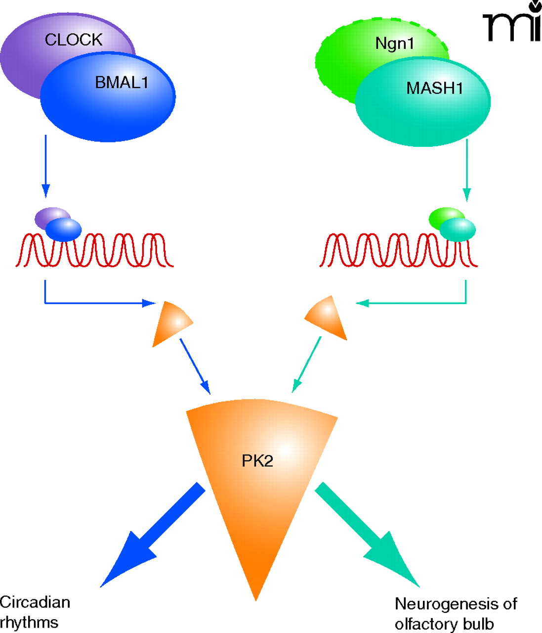Transcriptional regulation of prokineticin 2. The promoter of the PK2-encoding gene, in both human and mouse, contains multiple E-box sequences (CACGTG) that are targeted by basic helix-loop-helix (bHLH) transcription factors (ovals; CLOCK/BMAL1 and Ngn1/MASH1 dimers are schematized here). The expression of PK2 (orange) is a common functional target for both sets of transcriptional factors, although distinct biological processes are ultimately affected, depending the particular transcriptional machinery that is recruited (indicated by different shades of blue arrows). PK2 is also induced by hypoxia (as is PK1), and thus HIF-1 (hypoxia-inducing factor, also a bHLH transcription factor) may also regulate the functionality of PK2. (The dashed outline around Ngn1 is intended to indicate the speculative nature of its specific transcriptional role in this instance. See text for details.)