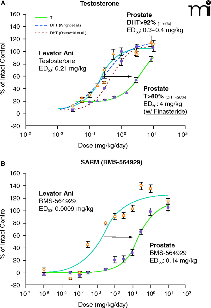 Tissue-specific expression of 5α-reductase contributes to the tissue selectivity of SARMs. (A) Partial agonist activity of testosterone in the prostate was revealed when co-administered with type 2 5α-reductase inhibitor finasteride. Dose-response curves of T in the levator ani muscle (•) and T in the prostate (○ and dotted line) were redrawn with permission from Ostrowski et al. (12); and dose-response curves of T in the prostate with (▴) or without (▵ and dash line) co-administration of finasteride were redrawn with permission from Wright et al. (14). T data from two different studies [Wright et al. (14) dotted line; and Ostrowski et al. (12) dash line] are compared directly here, considering the fact that both studies used a re-growth model (T treatment after castration caused complete shrinkage of the prostate) with SD rats of similar age and subcutaneous administration of T. Furthermore, the dose-response curves of T in the prostate (largely DHT due to 5α-reductase action) obtained from two studies largely overlap, with similar ED50 values between 0.3~0.4 mg/kg/day, showing that these two studies are comparable. (B) Partial agonist activity of SARM (hydantoin analog BMS-564929) in the prostate when administered alone. BMS-564929 was orally administered because it is orally available. Dose-response curves redrawn with permission from (12).] T, testosterone.