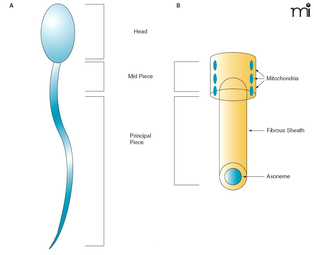Structure of sperm. A. Major elements of human sperm. B. The ultrastructure of the mid piece (upper) and the principal piece (lower). Note the absence of mitochondria in the principal