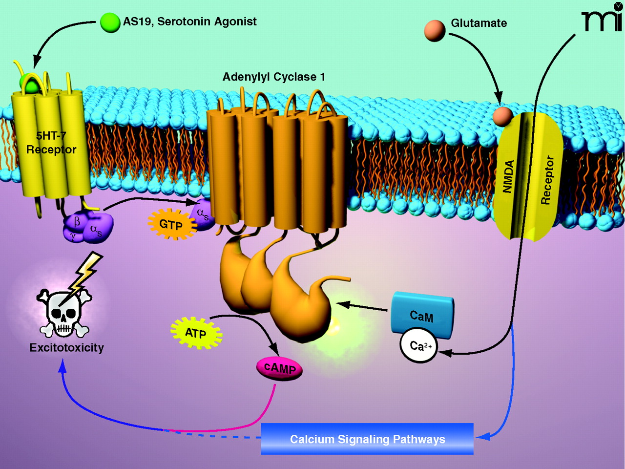 A model forN-methyl-D-aspartate receptor (NMDAR)-mediated excitotoxicity involving adenylyl cyclase type 1 (AC1). Activation of AC1 by the NMDA receptor (NMDAR), but not by the serotonin (5-hydroxytryptamine) subtype 7 receptor (5-HT7R), leads to excitotoxicity. Although the mechanism for excitotoxicity requires further study, the report by Wang et al. (1) suggests that glutamate activation of the NMDAR leads to excitotoxicity mediated through AC1, which appears to require involvement of additional Ca2+-modulated pathways (blue arrows). That is, activation of AC1 appears to be a necessary but not sufficient condition for excitotoxicity. AS19, a serotonin agonist; CaM, calmodulin; cAMP, cyclic AMP.