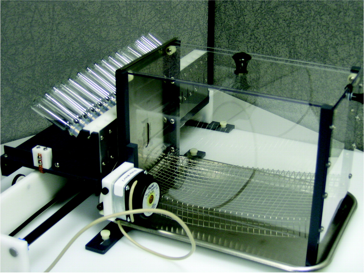 Davis Rig “Lickometer” for the brief-access taste assay. Rodents that are mildly water-deprived lick solutions from up to sixteen bottles arranged in the “lick block.” Spouts from each bottle are presented one-at-a time through the port in the front of the cage. A “lick” is recorded each time the rodent’s tongue makes contact with the spout.