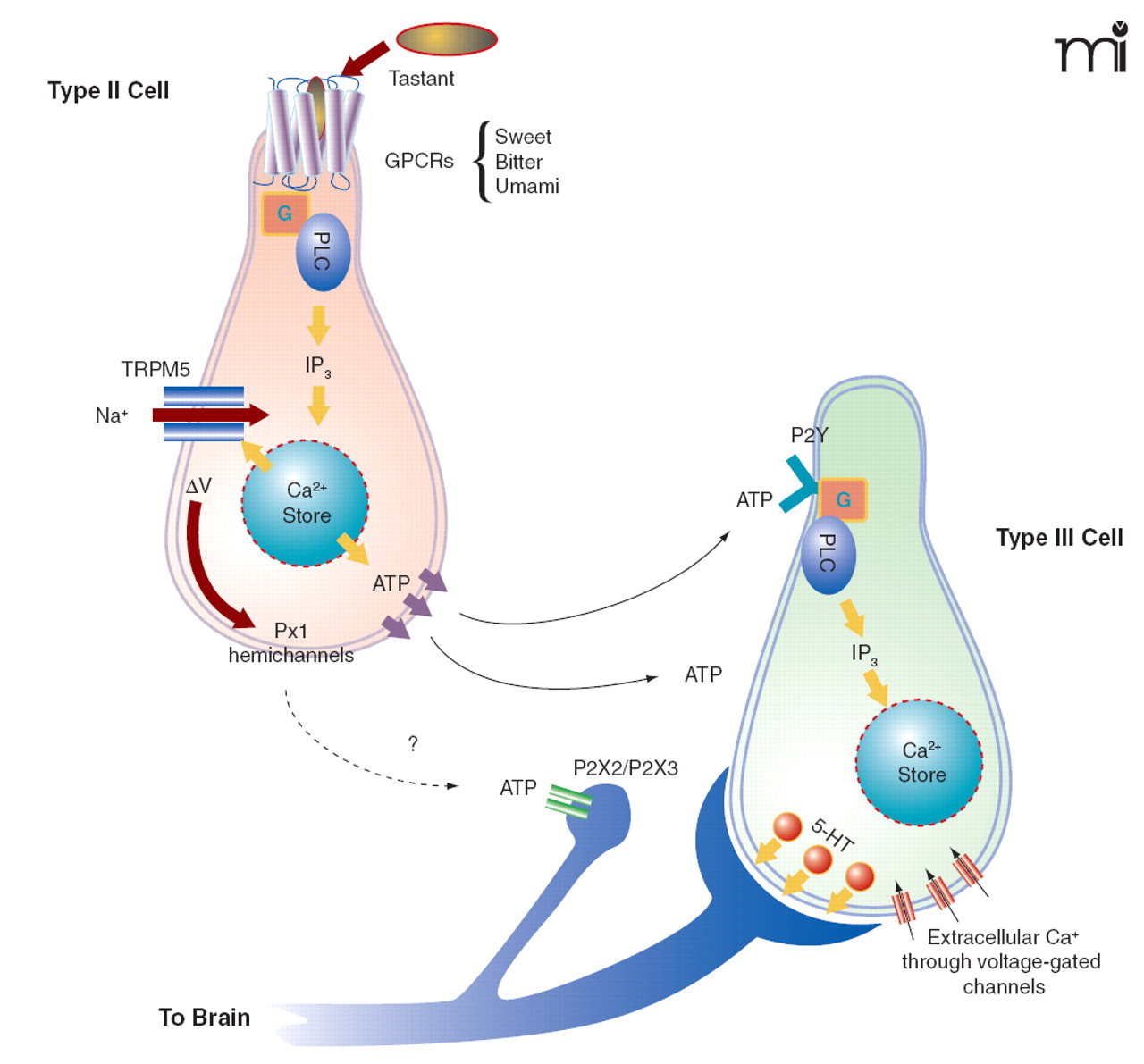 The taste cell signaling model. Tastant molecules, acting as agonist ligands, bind to and stabilize the active conformation of GPCRs in the apical microvilli of type II taste cells. The active receptor interacts with gustducin and other G proteins that consequently release their βγ subunits to stimulate PLCβ2. Hydrolysis of membrane PIP2 by PLCβ2 generates inositol trisphosphate (IP3) that, in turn, interacts with and opens the IP3R3 channel on internal calcium stores. The increase in [Ca2+]i activates TRPM5-mediated changes in membrane potential (ΔV), and subsequently ATP is released through the pannexin-1 hemichannel. Secreted ATP acts on P2Y purinergic receptors on type III taste cells, causing the exocytotic release of 5-HT into the synapse between type III cells and afferent sensory neurons. ATP from type II cells is also believed to stimulate afferent sensory neurons. Model diagrammed according to (128, 133) and Stephen Roper, personal communications.