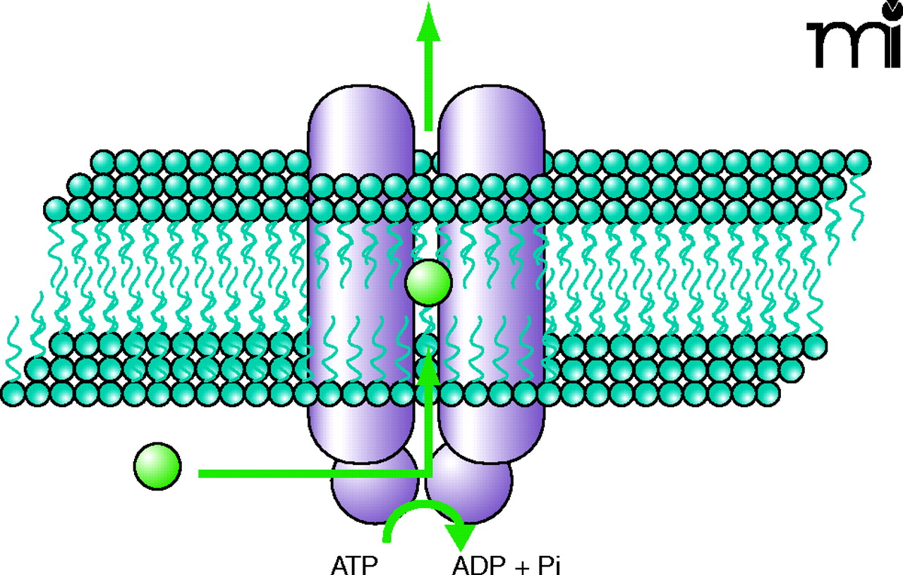 Illustration of an ABC drug-efflux transporter. An ABC drug transporter is typically composed of two substrate-specific membrane-spanning domains, which provide a pathway