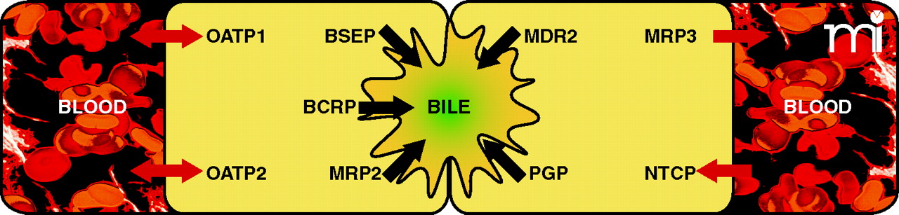 Hepatic drug transporters whose expression is influenced by inflammation. P-glycoprotein (ABCB1), MDR2 (ABCB4), BSEP (ABCB11), MRP2 (ABCC2) and BCRP (ABCG2) are involved in the efflux of substrates into bile, whereas MRP3 (ABCC3) mediates basolateral efflux into plasma. Sinusoidal uptake transporters include NTCP (Slc10a1), OATP1 (Slc21a1) and OATP2 (Slc21a5), although OATP1 and OATP2 are also involved in substrate efflux.