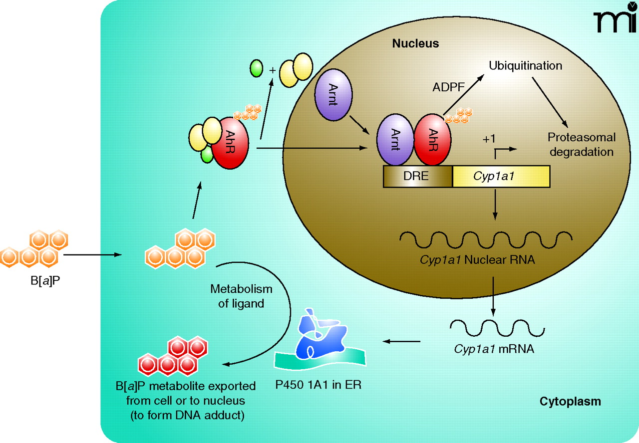 Induction of Cyp1a1 and ADPF-controlled degradation of nuclear AhR. In the absence of an agonist, the quiescent AhR is in a complex with two molecules of hsp90 (yellow ovals) and the AIP protein (green oval) in the cytoplasm; B[a]P-binding activates AhR, which translocates into the nucleus and dimerizes with Arnt; the AhR-Arnt dimer binds to a dioxin responsive element (DRE) and initiates the transcription of Cyp1a1. B[a]P-activated AhR is degraded through the ubiquitin-26S proteasome pathway that is controlled by ADPF (as a probable E3) in the nucleus. Cyclohexmide (CHX) blocks the synthesis of ADPF and consequently the B[a]P-induced degradation of nuclear AhR, resulting in superinduction. ADPF, AhR degradation promoting factor; AhR, Aryl hydrocarbon receptor; AIP, AhR-interacting protein; B[a]P, benzo[a]pyrene; Arnt, Aryl hydrocarbon receptor nuclear translocator; ER, endoplasmic reticulum.