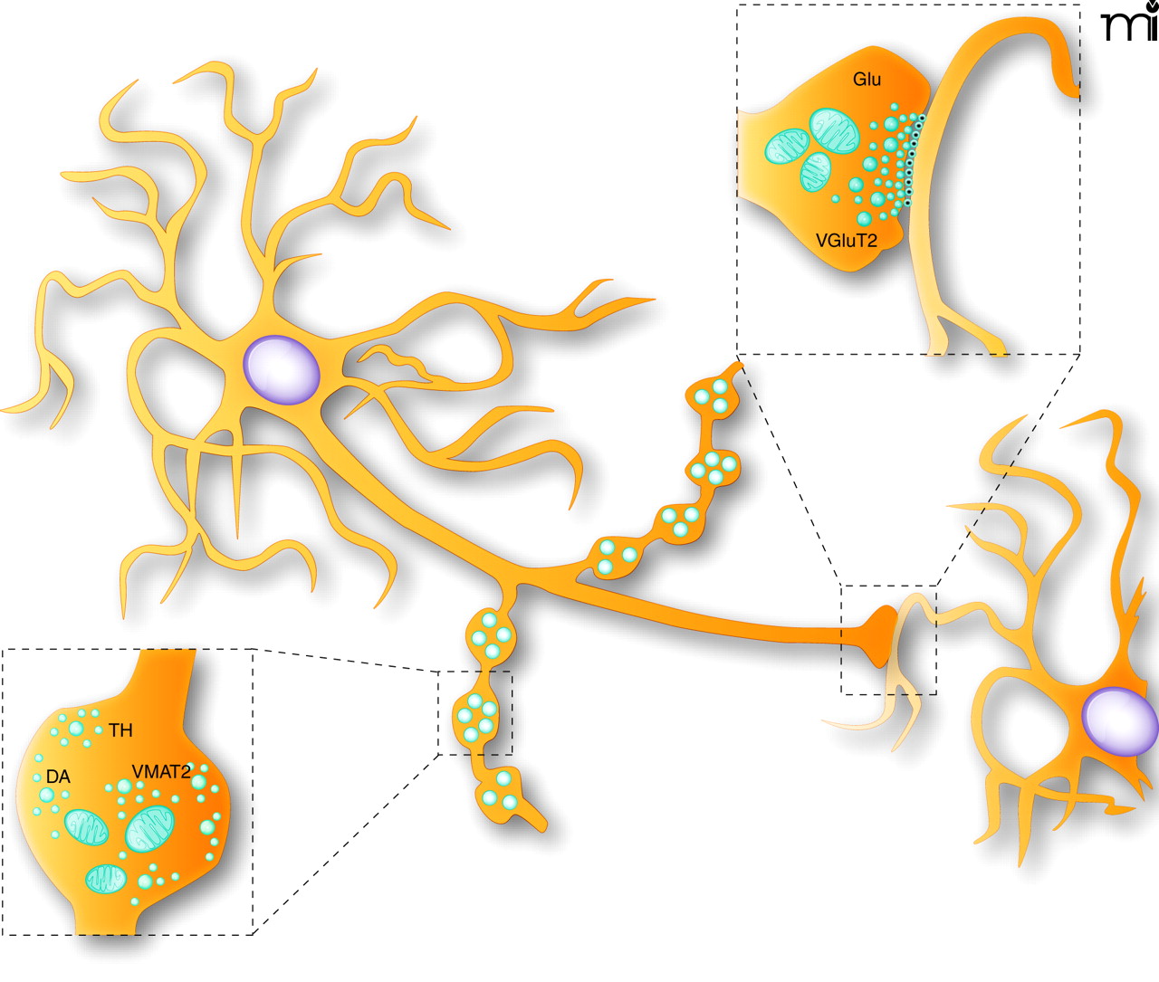 Schematic representation of the synaptic and non-synaptic axon terminals established by dopamine neurons. DA neurons are known to establish two morphologically distinguishable axon terminals: some that are non-synaptic and others that are synaptic. The non-synaptic terminals (varicose-like structures) display no obvious pre- and postsynaptic specialization (see lower illustration showing a magnified view of a single non-synaptic terminal), contain tyrosine hydroxylase (TH) and could be specialized for the release of DA. The synaptic terminals display a more classical active zone, postsynaptic density and synaptic cleft, and could be the site of VGluT2 expression and of glutamate (Glu) release (see upper illustration showing a magnified view of a synaptic axon terminal).