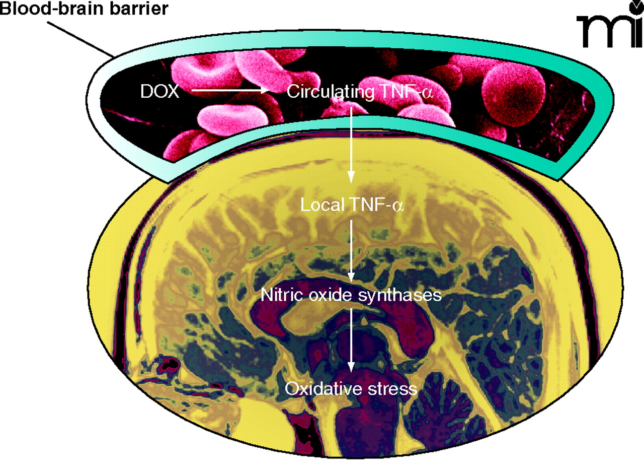 Proposed mechanism of DOX-induced oxidative stress in brain. DOX leads to increased levels of circulating TNF-α, which can pass the blood-brain barrier and trigger local production of TNF-α in the brain. Increased levels of TNF-α may in turn induce the expression of nitric oxide synthases, leading to oxidative stress.